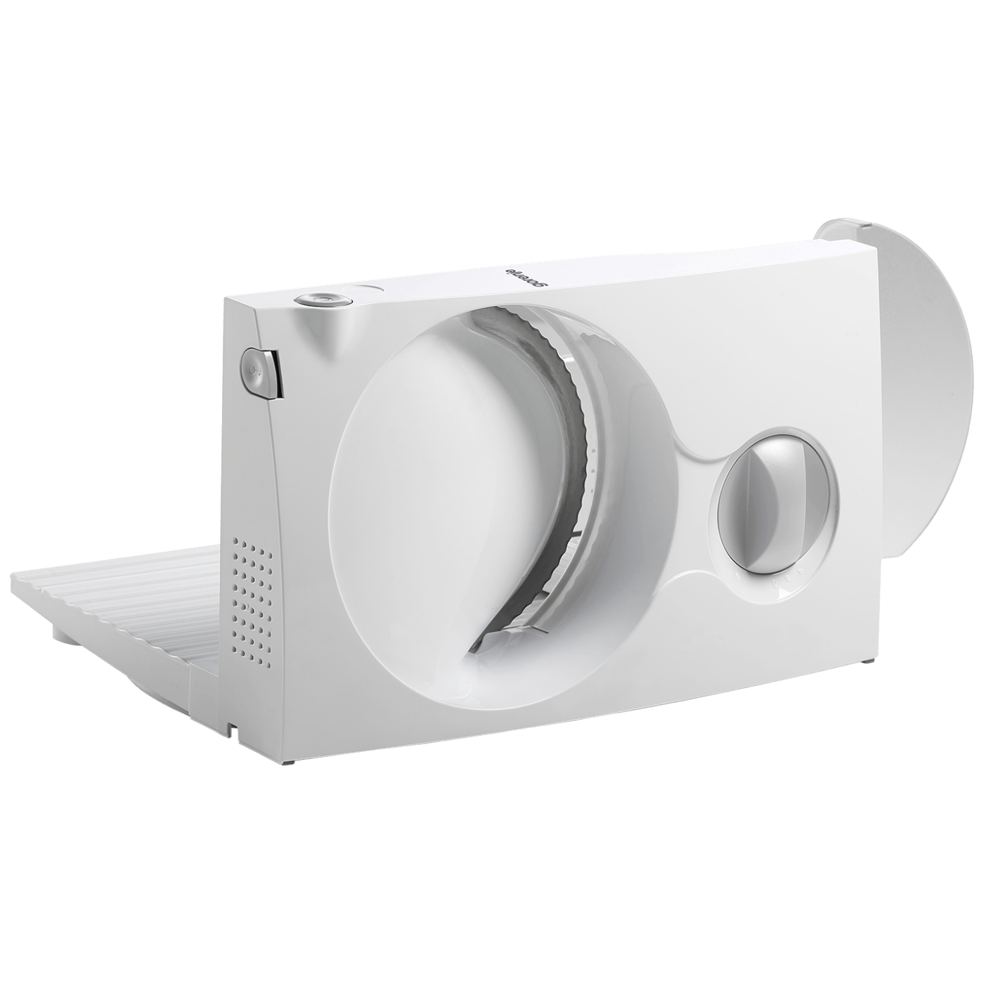 Rezalica R401W, snaga motora 100W, metalno kućište, Solingen oštrica, prečnik 17 cm, debljina reza 0 - 17 mm, nazubljeno sječivo, pranje nastavaka u mašini za pranje posuđa za brzo i efikasno čišćenje, tipka za trenutno uključivanje s osiguračem, odstraniva podloga i nož, mogućnost skidanja klizne površine, prostor za smještanje priključnog kabla za jednostavno spremanje, gumirane nogice za stabilnost, sigurnosni prekidač