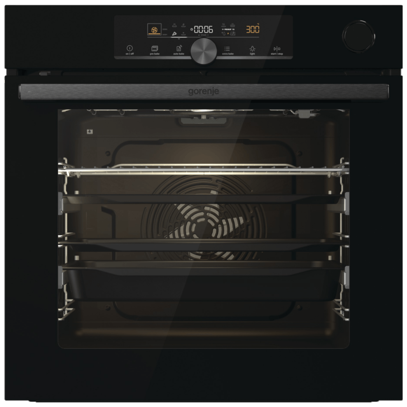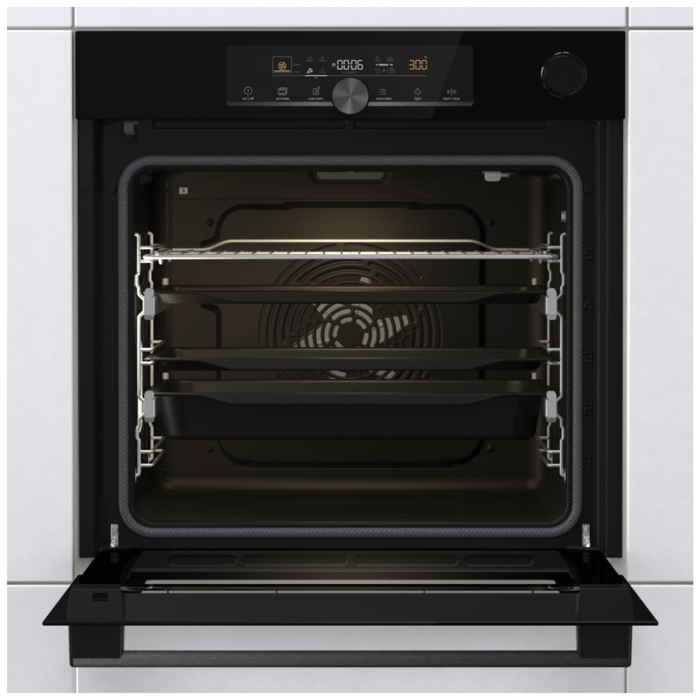 Multisistemska ugradbena pećnica sa ventilatorom, upotrebljivi obim pećnice 77 lit., max. temperatura 300 °C, veličina najveće posude za pečenje 1360 cm², posuda za vodu 0.13 lit.