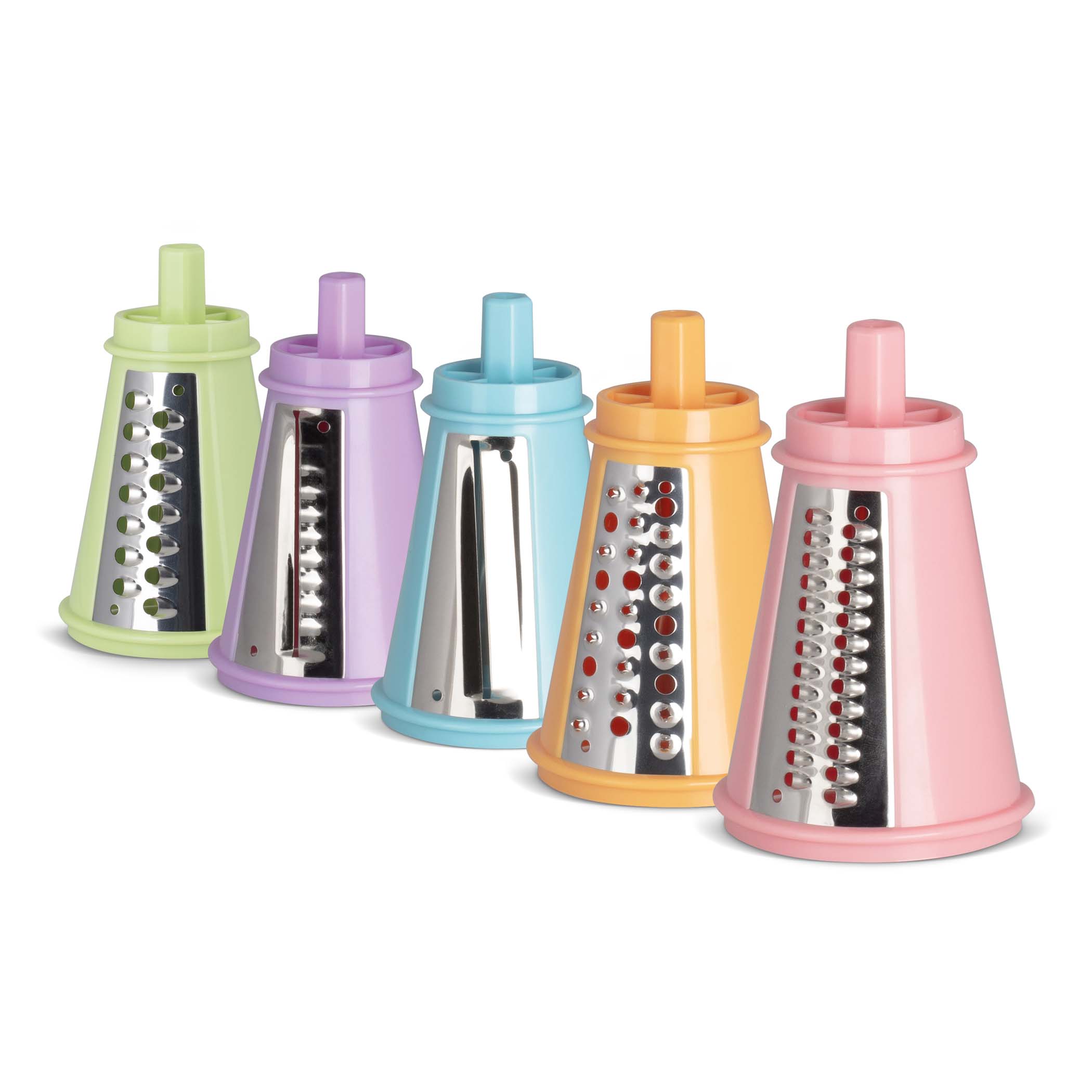 5 isporučenih izmjenjivih dodataka za savršene rezultate: rezač za tanke kriške, rende za valovite kriške, krupno rende, fino rende, vrlo fino rende