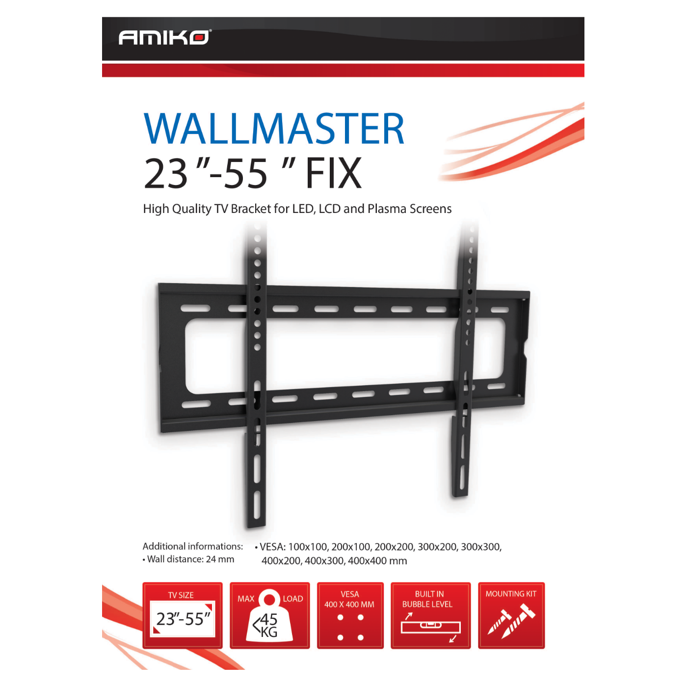 Amiko Nosač zidni za TV prijemnik 23" - 55", 45 kg, 1D - Wallmaster 23-55 FIX