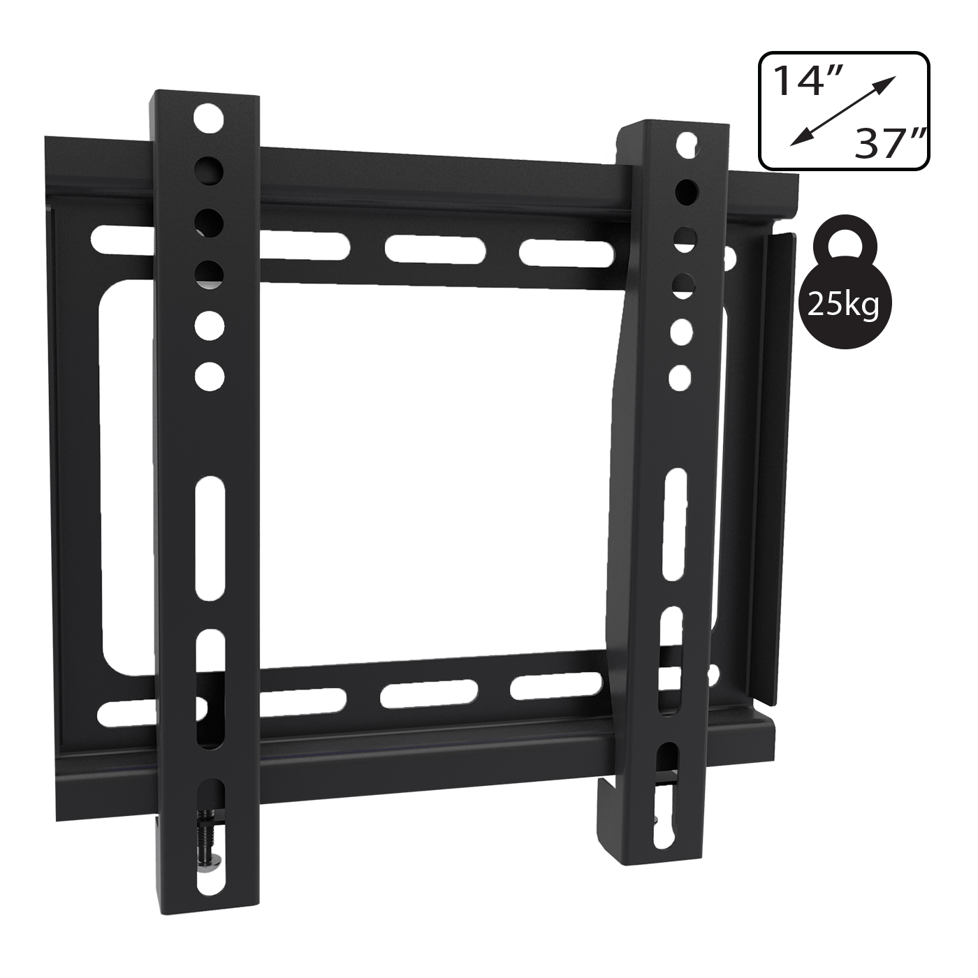Zidni nosač za TV prijemnike od 14 " do 37", maximalno opterećenje 25 kg, udaljenost od zida 23,5 mm, VESA 100x100, 200x100, 200x200, jednostavno za montažu i rukovanje, sadrži set vijaka, libelu i upute za uporabu
