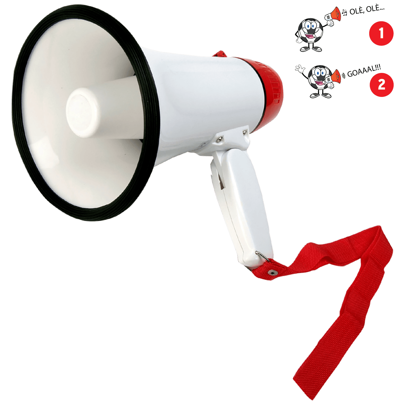 Navijački megafon, snaga 3.5 W RMS ( max. 5 W ), domet do 200 met., 115 dB, podesiva jačina zvuka, napajanje 4 x 1.5 type C baterije ( uključene u pakiranje), 8 - 10 h vrijeme rada, 2 funkcije rada: funkcija "himna" ( OLE, OLE, OLE... ), funkcija zvučnik, dimenzije 220 x 140, remen za nošenje