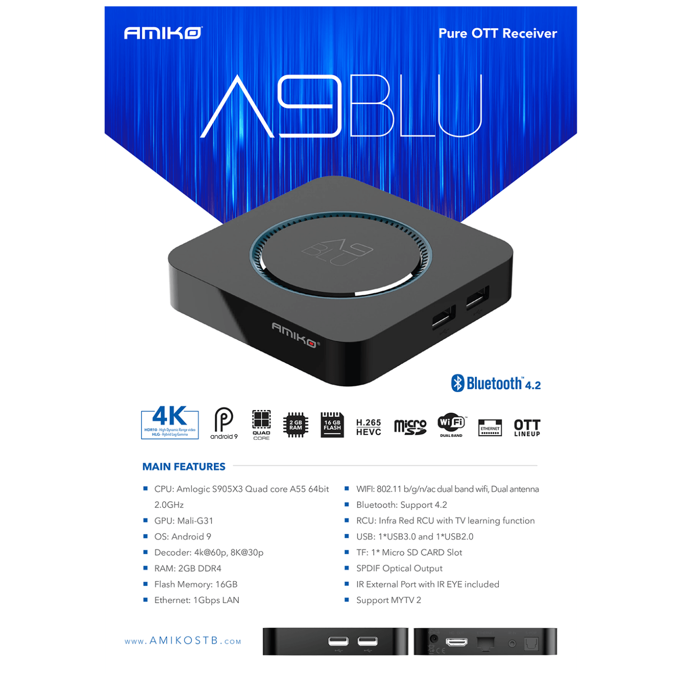 Amiko Prijemnik IPTV, Android OS, 2/16GB, 4K, WiFi, Bluetooth - A9 Blue