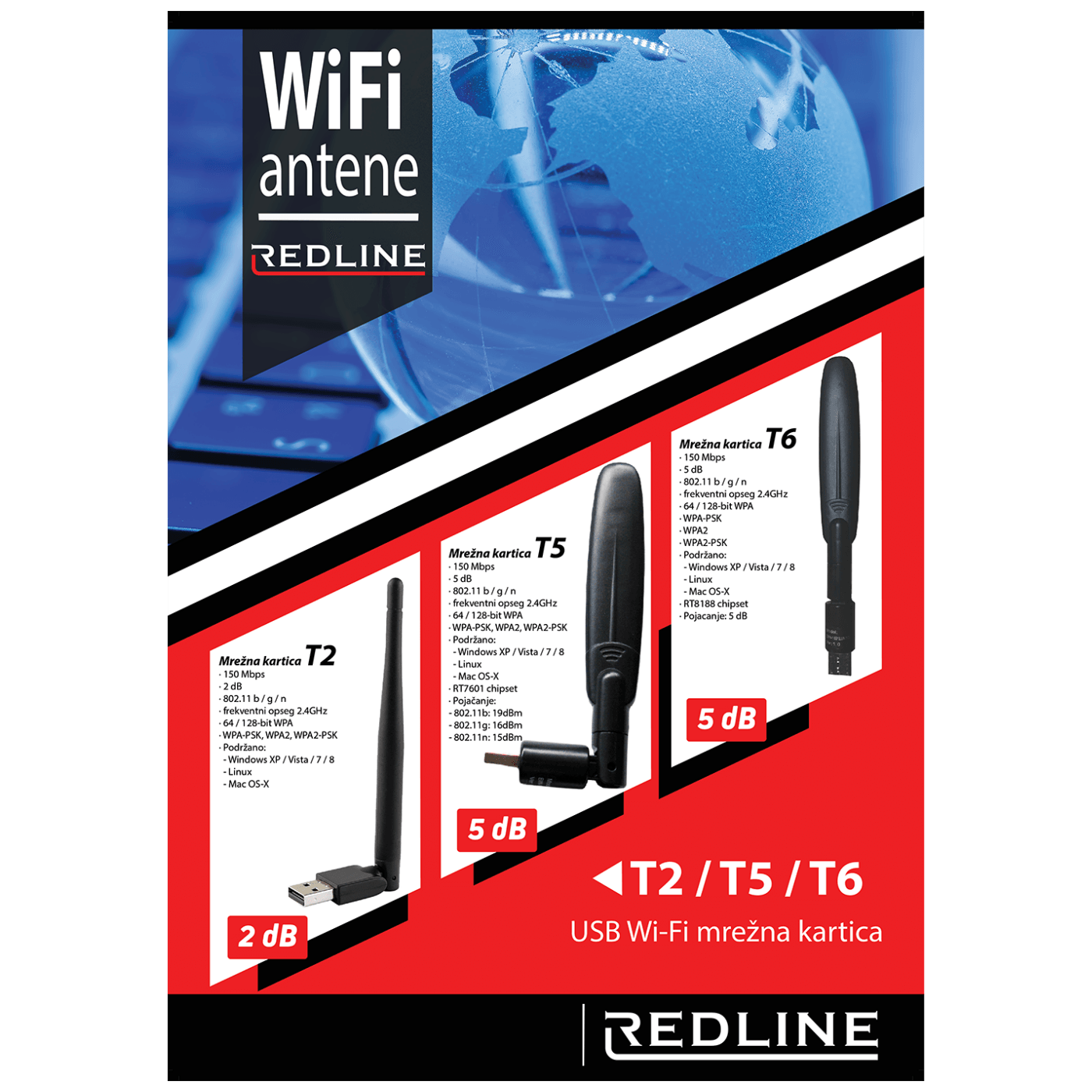 REDLINE Wi-Fi mrežna kartica, USB, 2.4 GHz, 5 dB, 150 Mbps, RT7601 - T5 WiFi antena