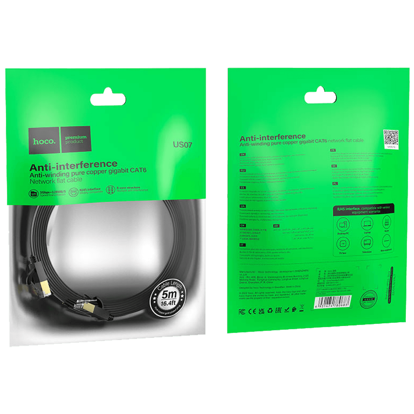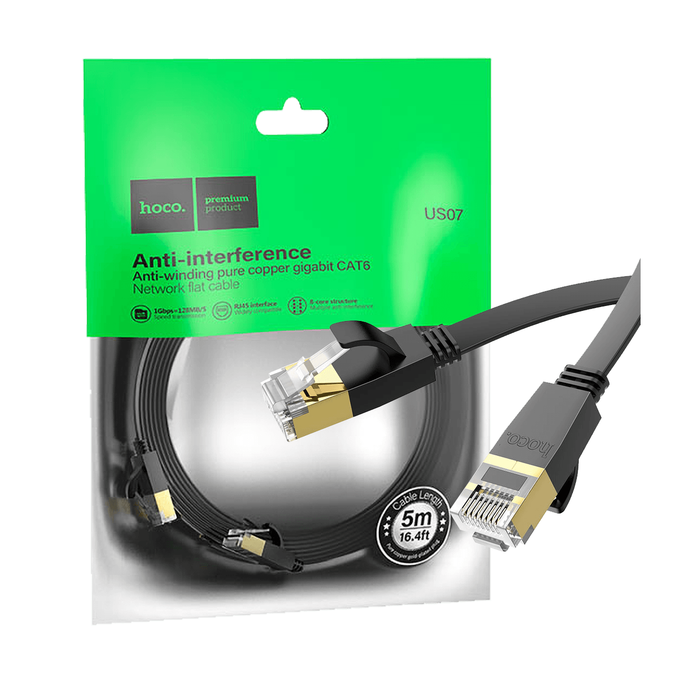 hoco. Mrežni kabl, CAT6, Gigabit Ethernet, flat, 5 met., crna - US07 General, 5 met.