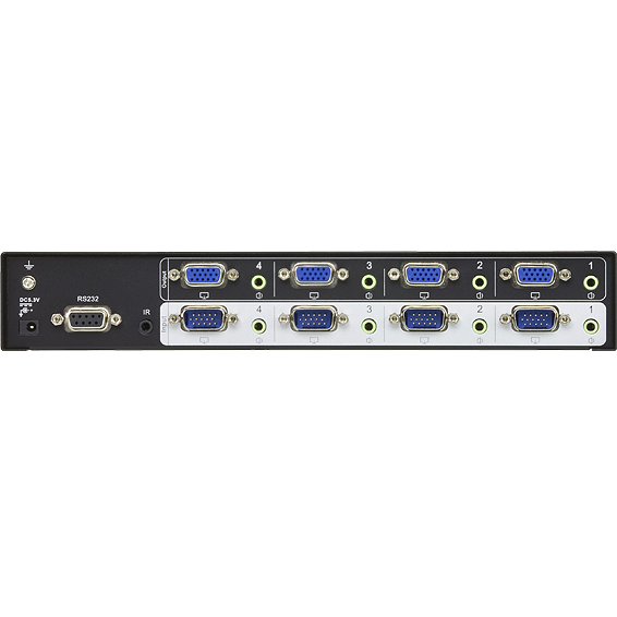 Video Matrix switch povezuje četiri VGA izvora sa četiri VGA monitora ili projektora (video / audio) u isto vrijeme, max. rezolucija 1920 x 1440, udaljenost prijenosa do 30 met, podržava do 300MHz propusnosti za visoke perfomance, jednostavno prebacivanje između više izvora i više zaslona na tipkama prednjeg panela, ugrađen dvosmjerni RS-232 port za kontrolu sustava, metalno kućište
