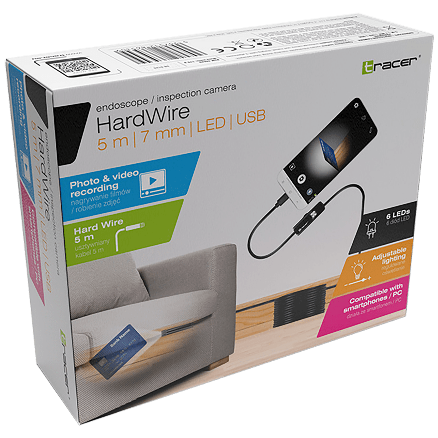 Višenamjenska endoskopska kamera, Tracer HardWire USB, bit će savršena za svaku situaciju u kojoj se vrši pregled / pristup teško dostupnim mjestima, kao što su kanalizacijske cijevi, ventilacijski otvori, strojevi, motori, vozila itd. Odabrano područje, osvijetljeni sa 6 LED dioda (s podesivim intenzitetom svjetla) mogu se fotografirati ili snimati i pohraniti na vaš telefon / računalo.