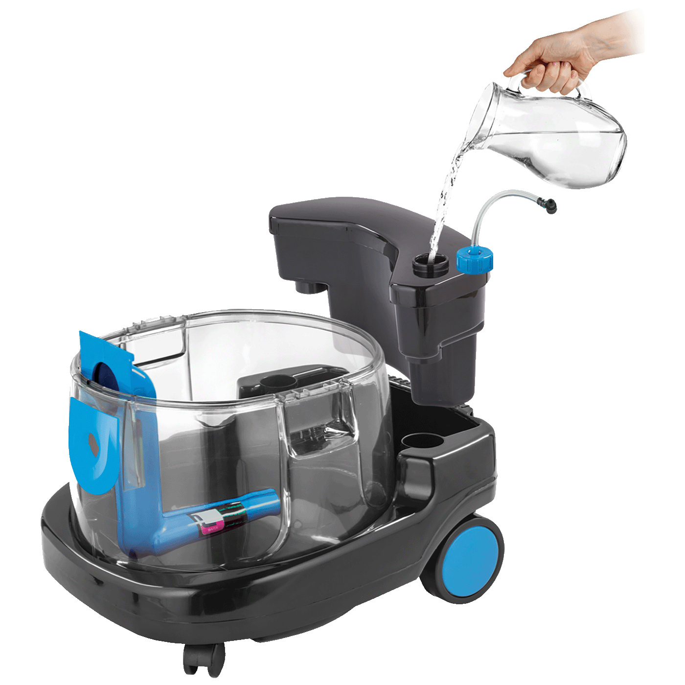 - Uređaj ima 2 spremnika za vodu od kojih je jedan kapaciteta 4 lit., i namijenjen je za ubacivanje čiste vode za korištenje vodenog usisavača, drugi spremnik je kapaciteta 10 lit. i to je spremnik u koji se skuplja prljava voda.