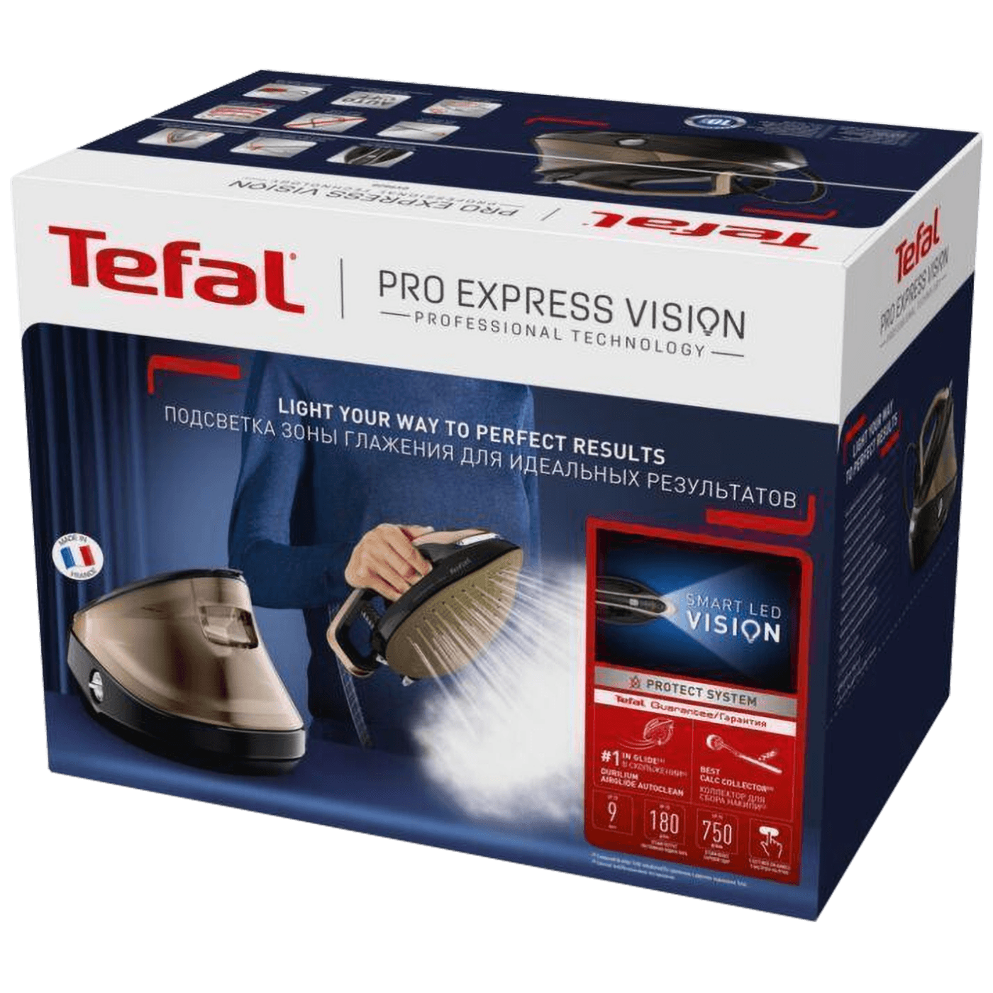 Pegla sa parnom postajom, Tefal Pro Express Vision, snaga 3000W, dodatni udar pare 180 g/min., udar pare 750 g/min., pritisak pare 9 bar., vertikalni udar pare, 5 elektronskih postavki pare i temperature, vrijeme zagrijavanja 2 min.