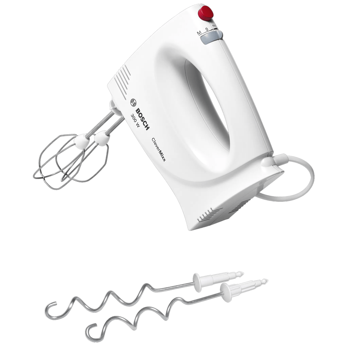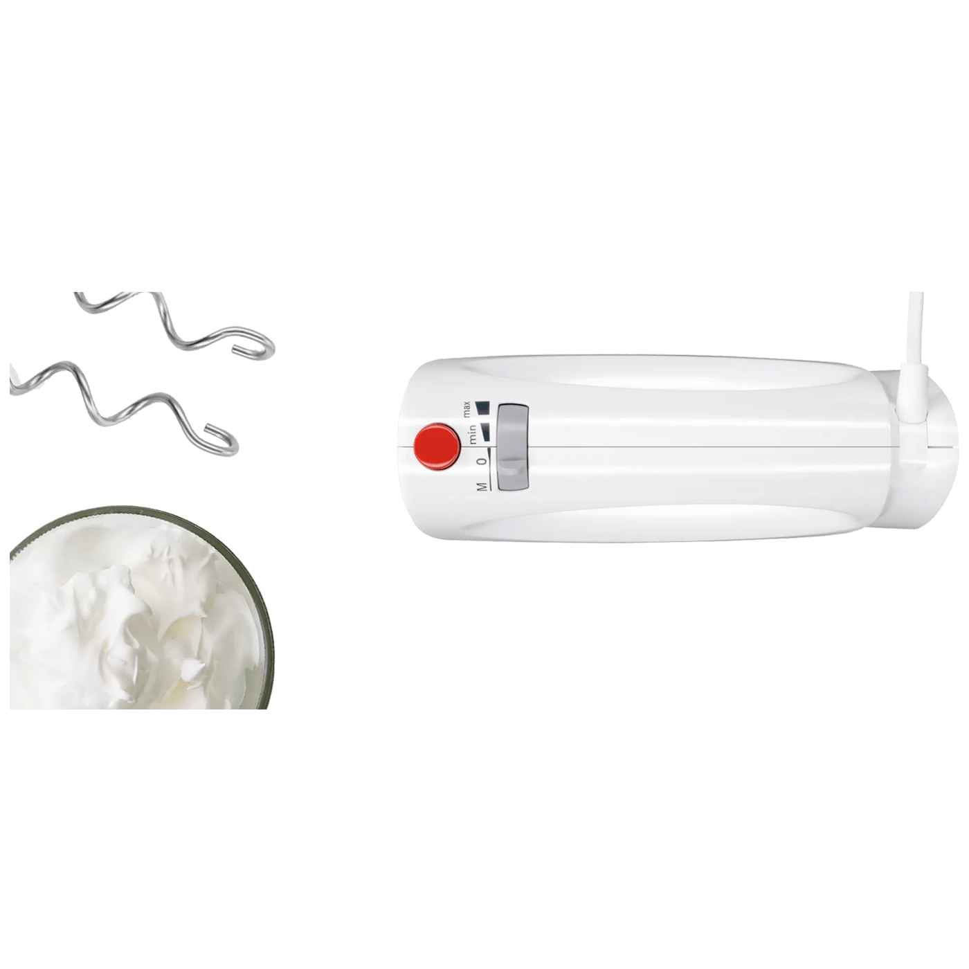 Ručni mikser, snaga motora 300W, 2 radne brzine + turbo, ergonomsko oblikovano kućište od otporne plastike, prikadan i za ljevoruke, tipka za izbacivanje metlica, dužina napojnog kabla 1,4 met