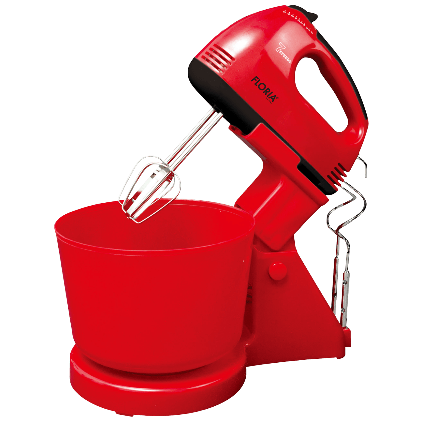 Mikser sa posudom, snaga 150 W, kapacitet posude 2.5 lit., 7 brzina rada, dvije kromirane metlice i kuke, dugme za izbacivanje sa sigurnosnim uređajem