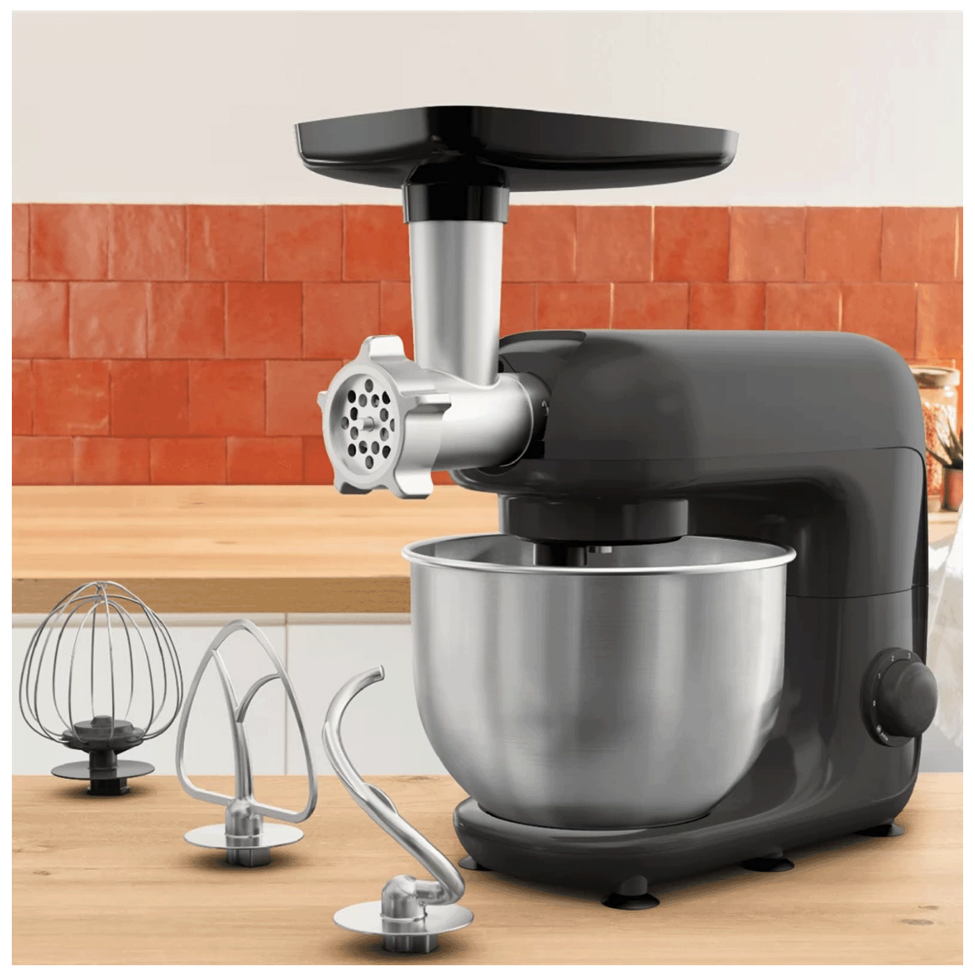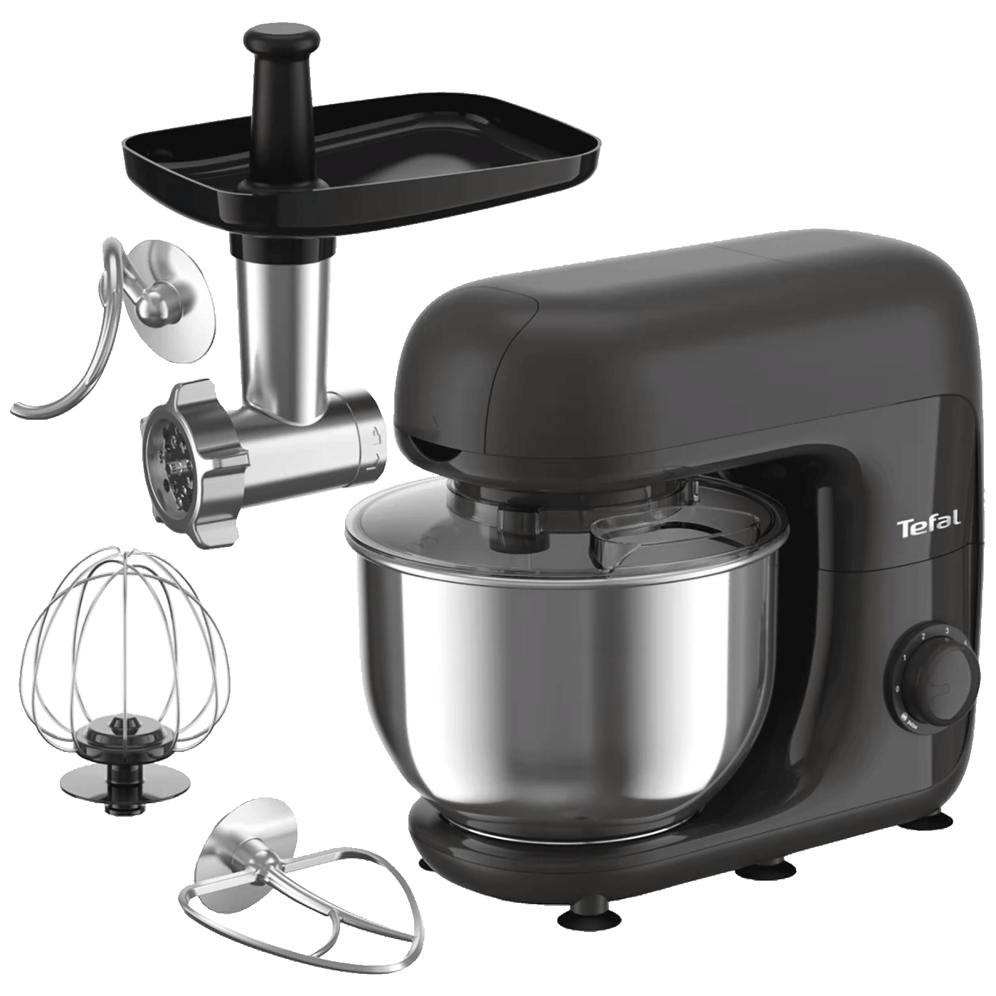 Ovaj model dolazi sa različitim dodacima uključujući metlice za miješanje, pjenjaču, kukice za tijesto i dodatak za mljevenje mesa sa dvije rešetke za fino i grubo mljevenje.