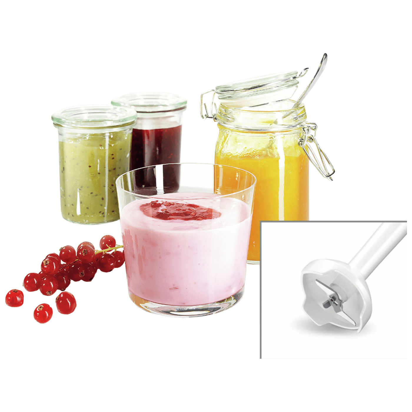 Štapni mikser, snaga motora 600 W, QuattroBlade nož sa četiri oštrice za savršene rezultate pasiranja, miješanja i sjeckanja, ergonomska ručka, sjecka bilje, parmezan, oraščiće, crvenog luka, mesa, sira i drugih tvrdih sastojaka brzo i jednostavno, jednostavno pasiranje i miješanje, rad bez prskanja, jednostavno pasiranje i miješanje, prozirni lončić za miješanje sa skalom za merenje i poklopcem, 1 x lončić za miješanje, 1 x noga za miješanje, plastična, 1 x univerzalna sjeckalica, dimenzije 385 x 60 x 60 mm