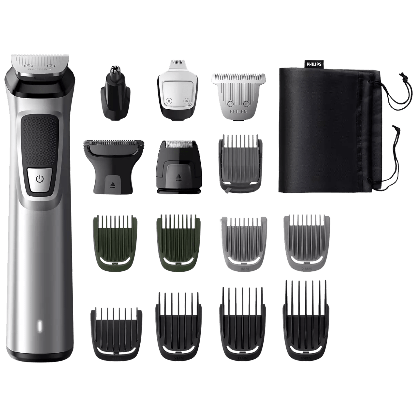 Detaljni metalni trimer, Precizni nastavak za brijanje, Široki nastavak za šišanje, Aparat za brijanje dlačica na tijelu, Nastavak koji štiti kožu, Metalni trimer, Trimer za nos i uši, Prilagodljivi češalj za bradu od 3 – 7 mm, 2 češlja za trodnevnu bradu, 4 široka češlja za kosu, 2 češlja za tijelo