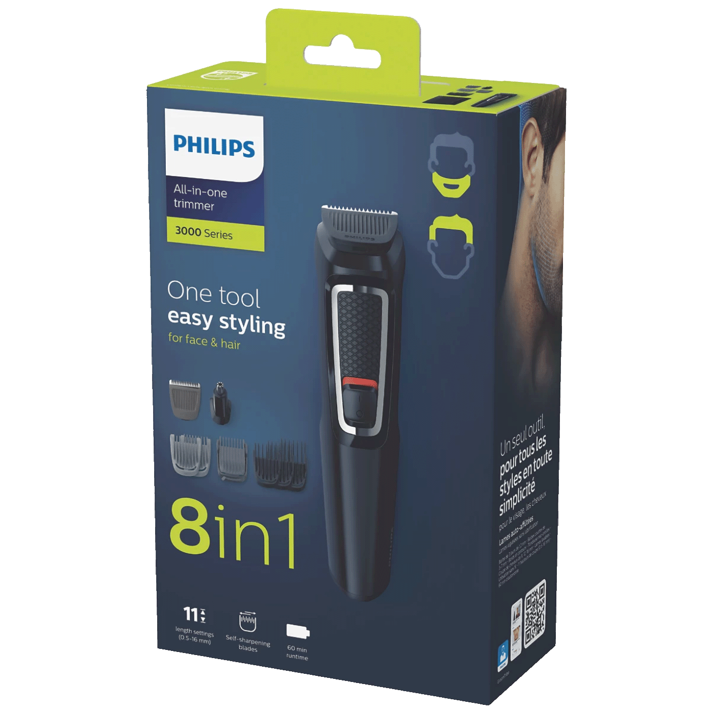 Višenamjenski trimer serije 3000 tvrtke Philips dolazi s 9 nastavaka koji su dizajnirani za praktično oblikovanje dlačica na licu i šišanje kose.