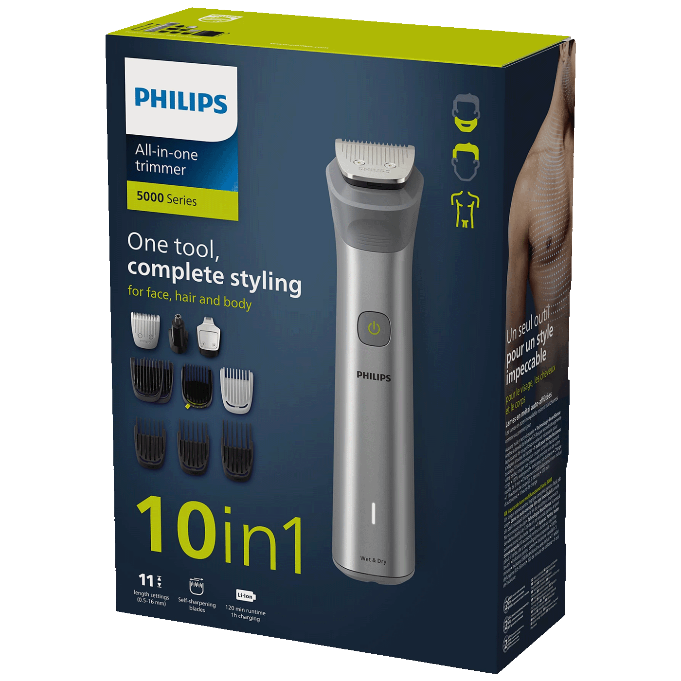 Ovaj trimer "sve u jednom" ima 10 alata za sve vaše potrebe. Jednostavno podrezujte i oblikujte dlačice na licu, šišajte kosu i uređujte tijelo.