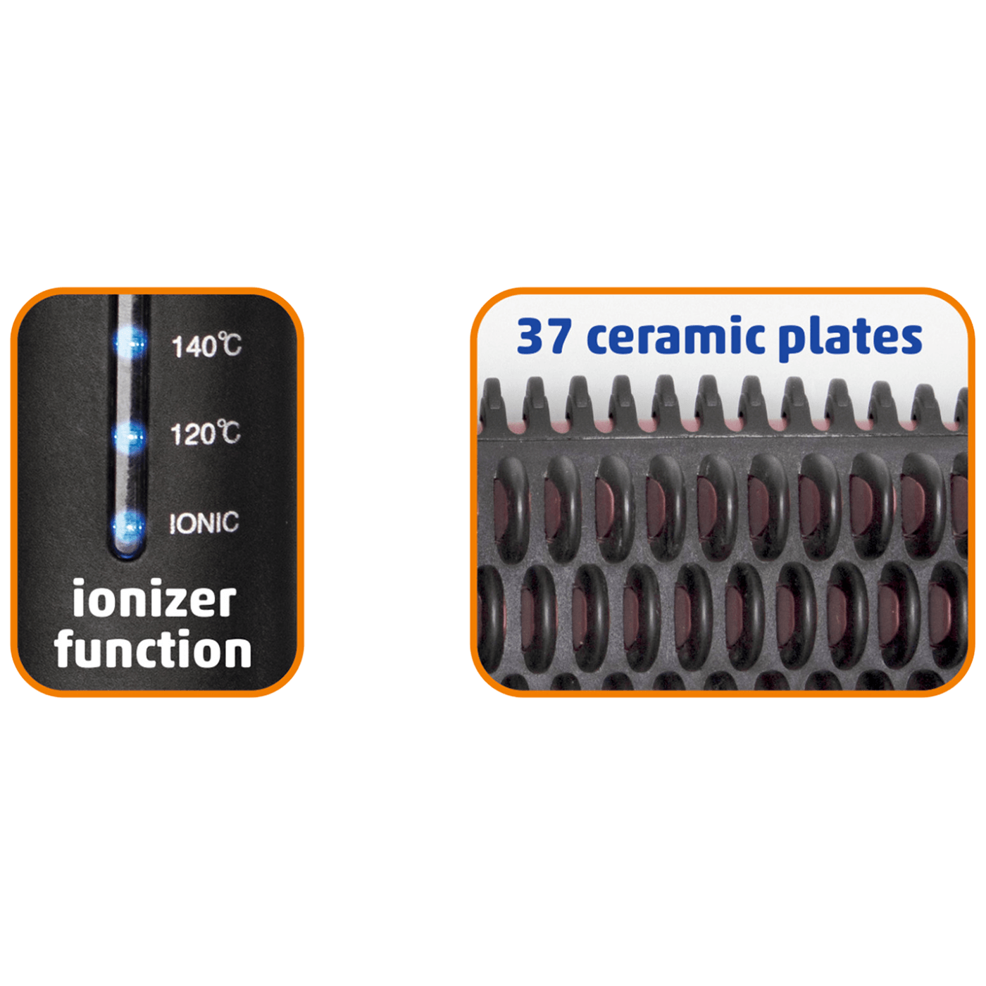 Četka za ravnanje kose, podesiva temperatura 120 - 200 °C, 37 grijačih elemenata sa keramičkim premazom, automatsko iskuljučivanje nakon 30 minuta, kukica za vješanje, 360° rotirajući napojni kabel, dužina napojnog kabela 1.8 met., dimenzije 380 x 70 x 50 mm