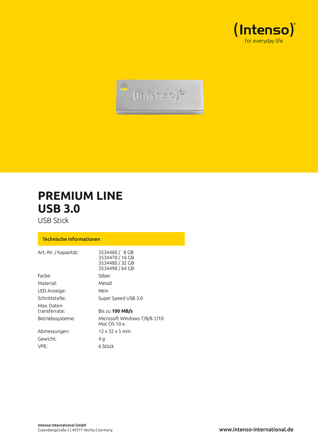 (Intenso) USB Flash 64GB Hi-Speed USB 3.0 up to 100MB/s, Premium Line - USB3.0-64GB/Premium Line