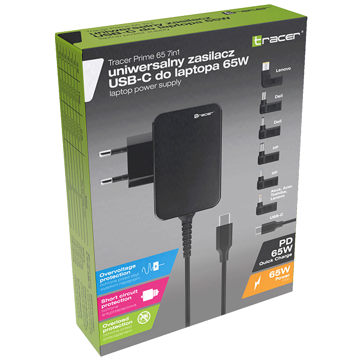 TRACER Prime 65 W adapter s PD Quick Charge savršen je za ljude kojima je potrebno brzo i sigurno punjenje prijenosnog računala.