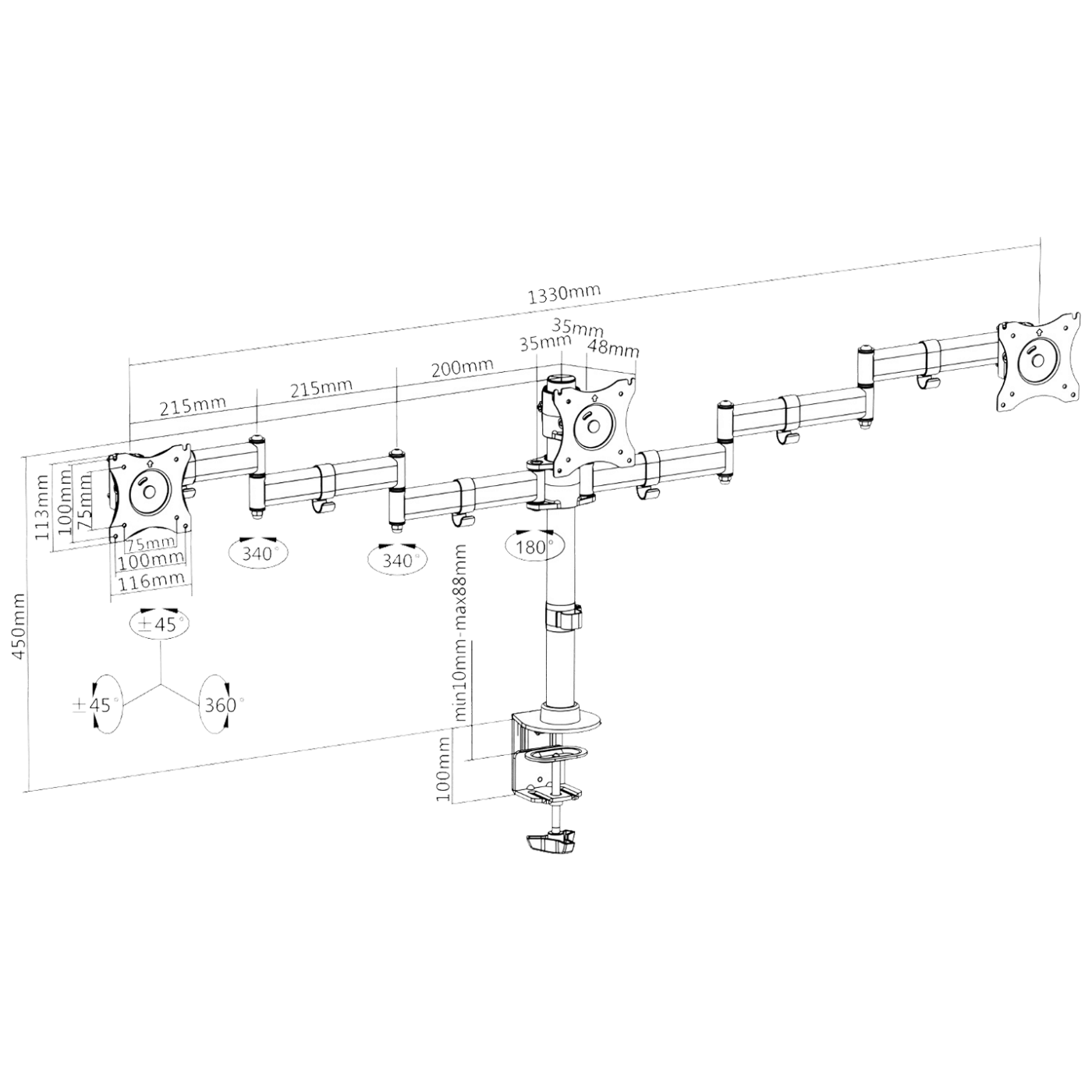 Nosivost do 8 kg. po nosaču, nagib držača monitora: +/- 45°,