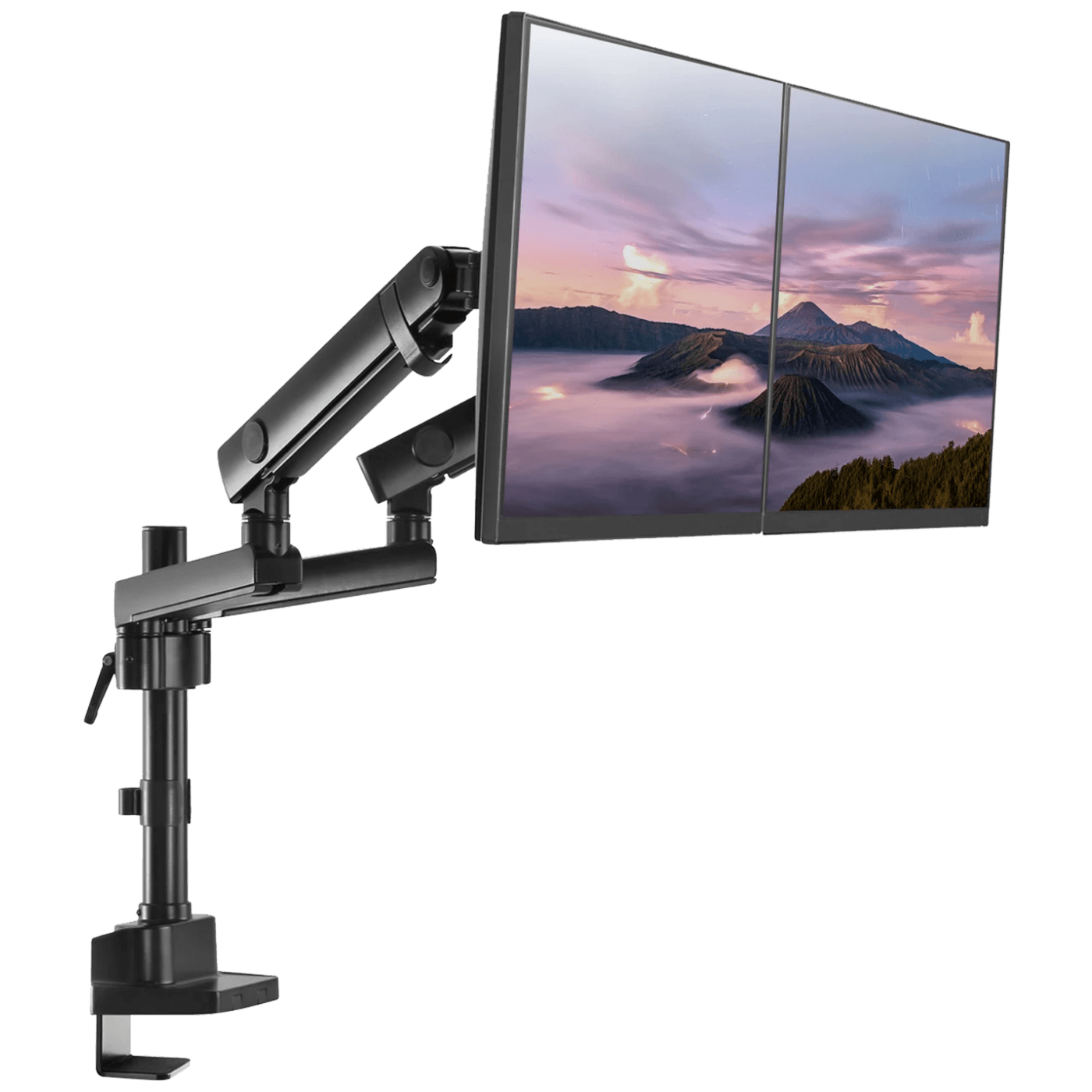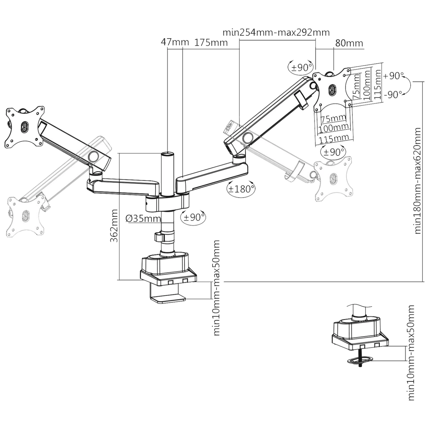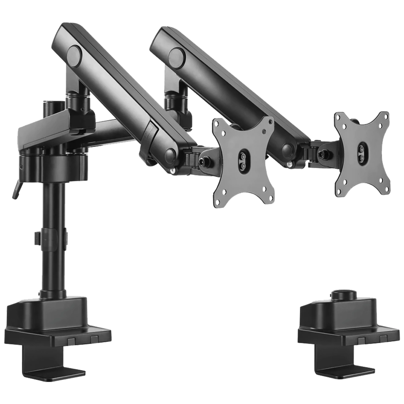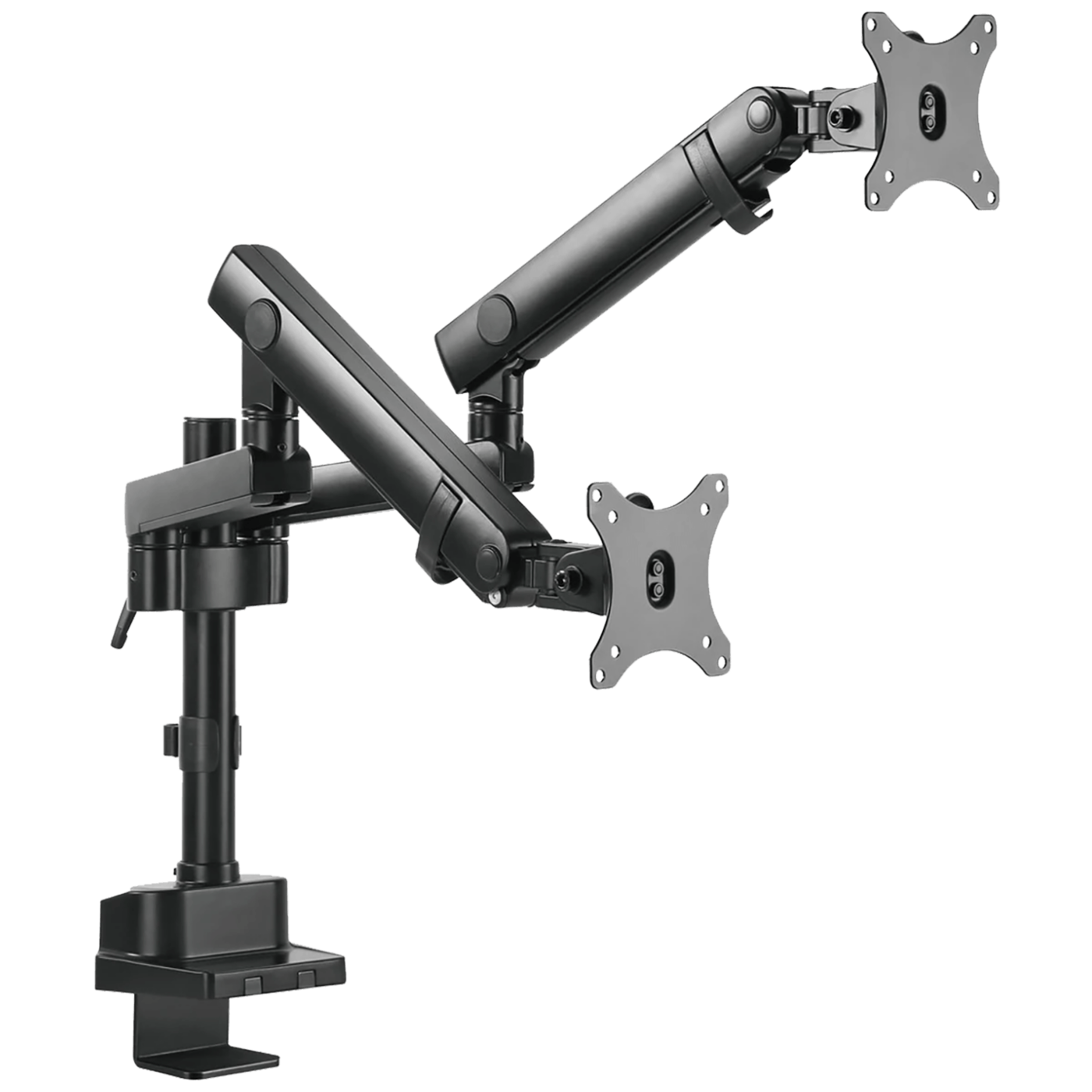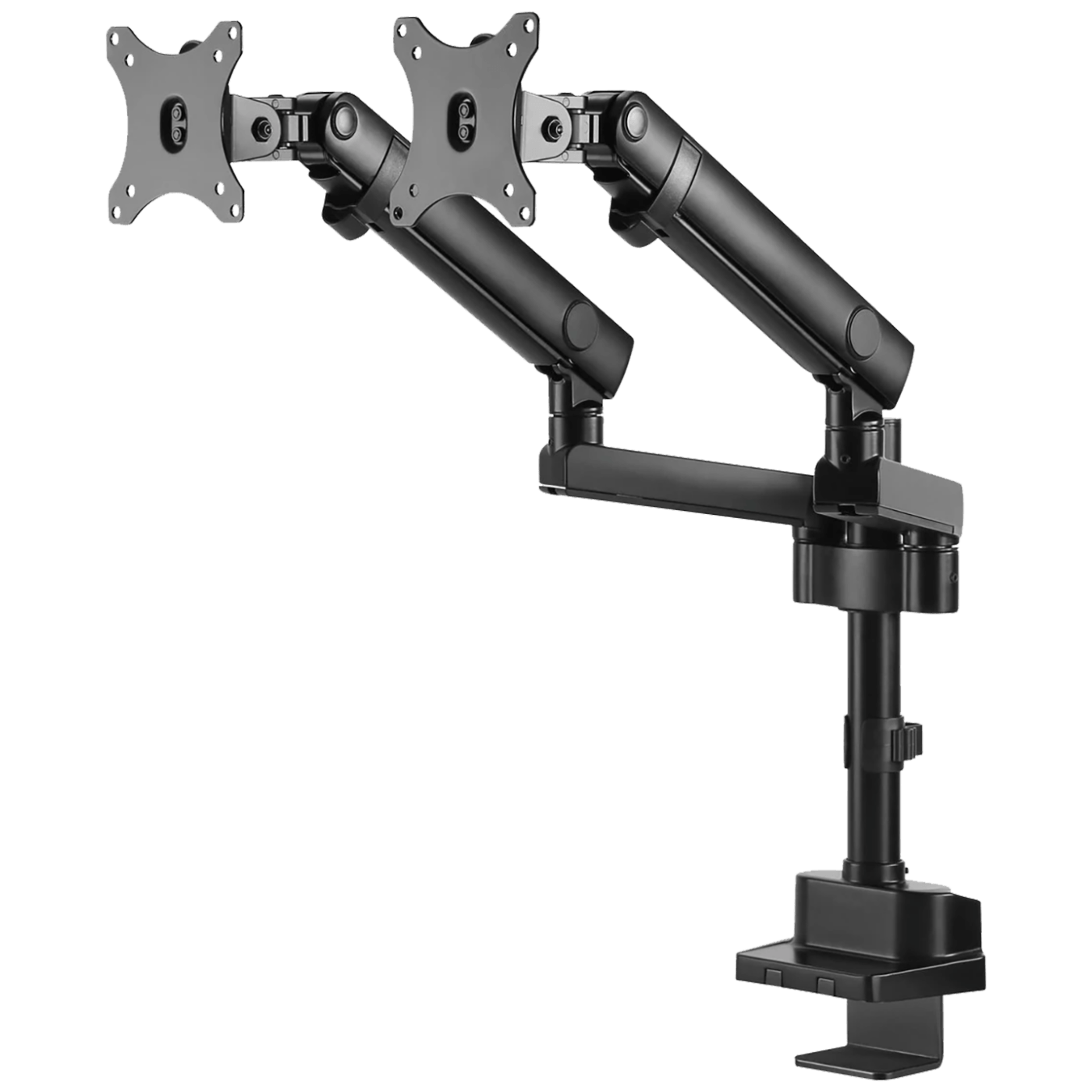 Nosivost do 16 kg. 8 kg.po nosaču, podesivi nagib od + 90° ~ -90°, podešavanje rotacije + 90° ~ -90°, podešavanje visine 180 mm - 620 mm, organizacija kablova, VESA razmak rupa od 75 x 75 ili 100 x 100 mm, plinske opruge