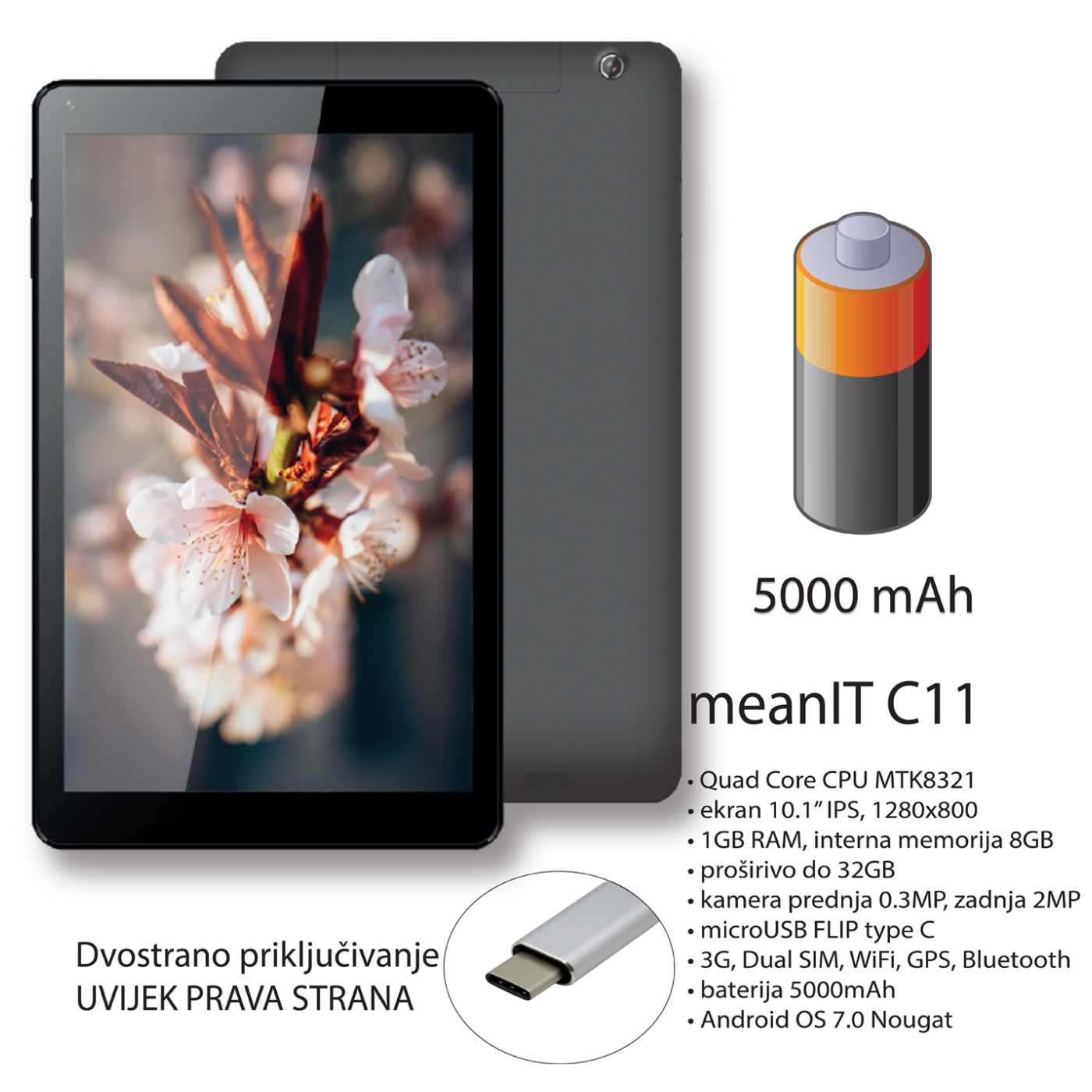 Povezivost: 3G, WiFI, Bluetooth, GPS, micro USB, FLIP konektor, Operativni sustav 7.0 Nougat
