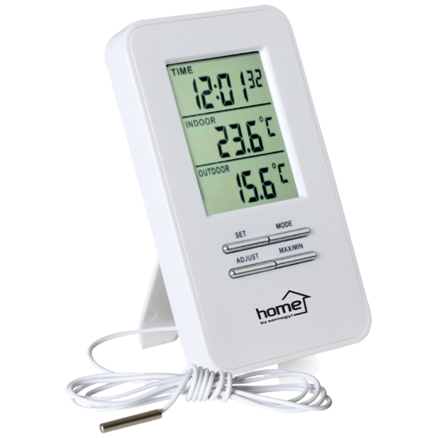 Vremenska stanica za mjerenje vanjske (-50 – +70 °C), unutarnje (-9 - +50°C), žična sonda za mjerenje vanjske temperature dužine 1,4 metra, prikaz min i max vrijednosti, prikaz 12/24 sata , prikaz datum, samostojeci na ravnoj povrsini , mogućnost montaže na zid. Napajanje 2 x 1,5V AAA baterije.