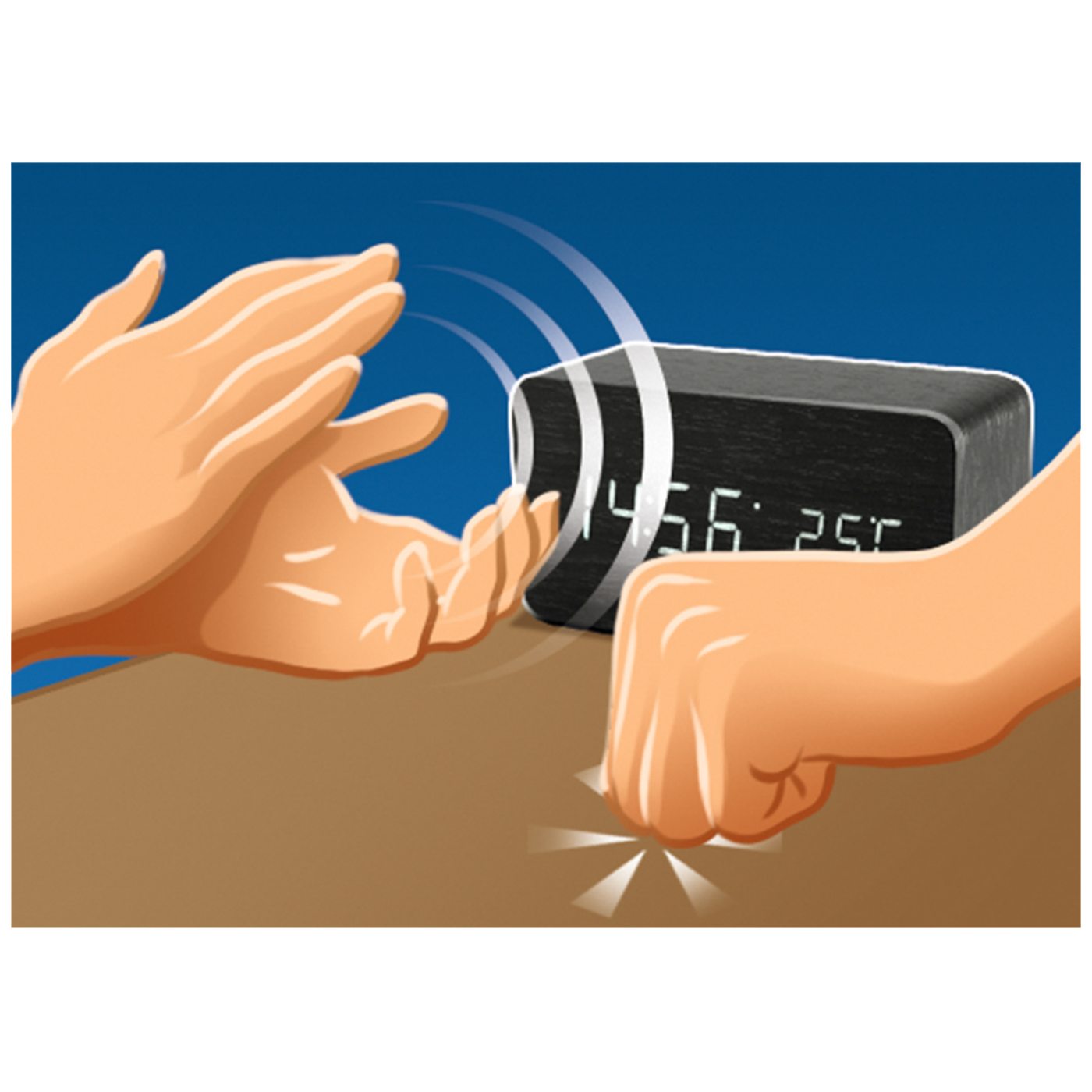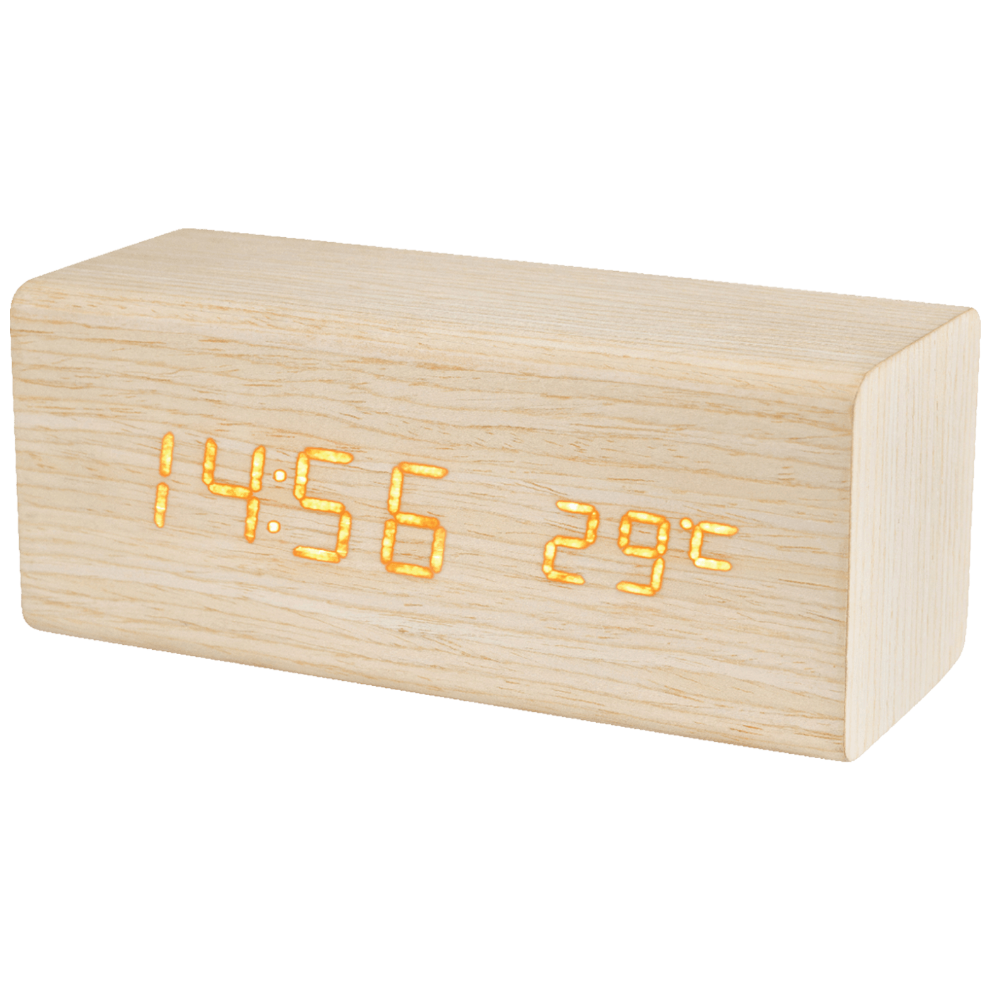 Digitalni sat sa alarmom, atraktivan dizajn, materijal izrade kućišta drvo, amber žuti LED display sa prikazom sat / datum / temperatura, 12/24 format vremena, temperatura od 0 .....50°C, alarm " beep", interval 1 min, 3 alarmska vremena istovremeno, LED display je moguće ugasiti, aktivacija LED display-a u OFF modu na dodir, alarmom, pljeskanjem rukama.