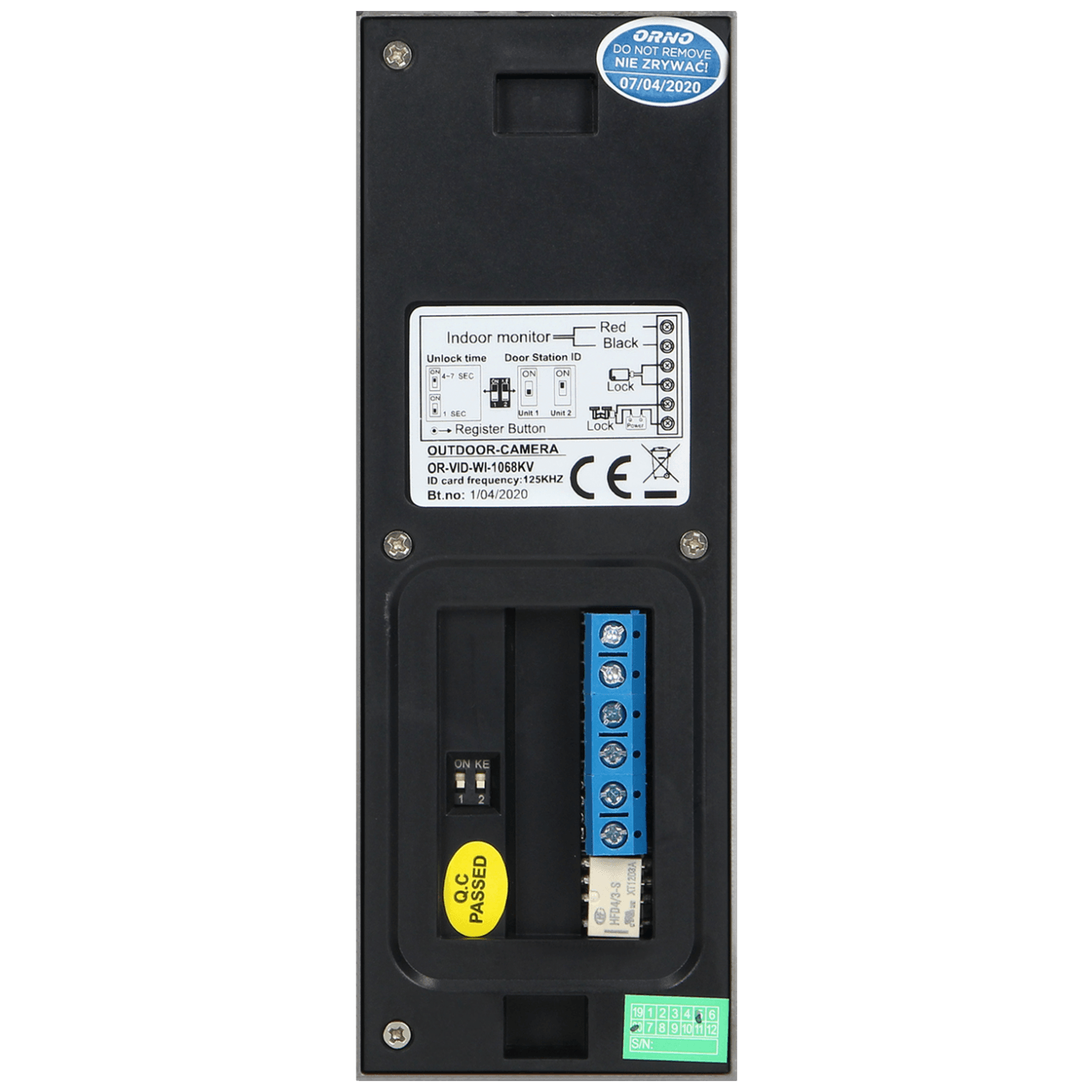Kamera ( vanjska jednica ), ugao gledanja vertikalno / horizontalno - 60° / 115°, RFID čitač kartica i tag ključa, IR noćno osvetljenje, dimenzije 47 x 133 x 26 mm