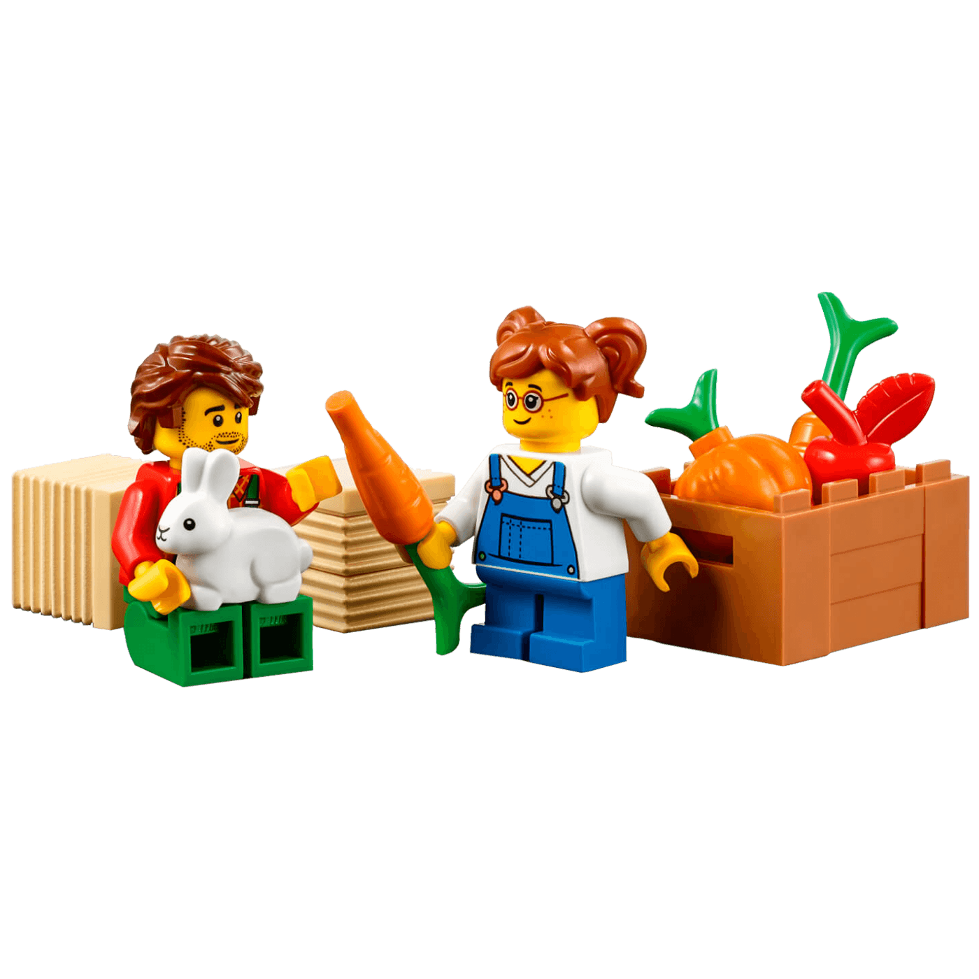 Zaputi se na selo u prepoznatljivom traktoru iz serije LEGO® City. Traktor ima velike stražnje gume, pa vožnja po otpornom terenu nije nikakav problem. Utovari bale sijena i sanduk sa bundevom, jabukom i mrkvama u traktorovu kašiku. Zatim ih podigni u zrak i odvezi do poljoprivrednika i njegove kćeri koji trebaju nahraniti gladnog zeca!