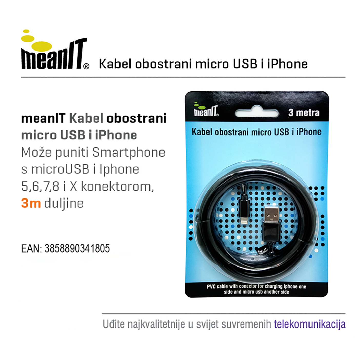 MeanIT USB kabl sa micro USB i iPhone priključkom, 3 met - KABEL MICROUSB / iPHONE