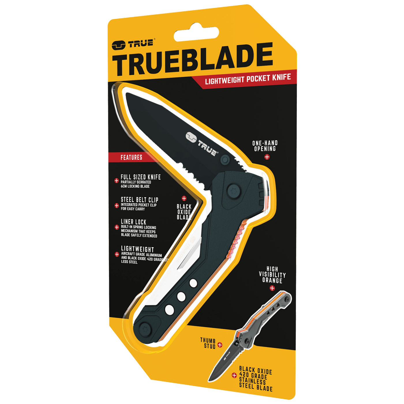 Trueblade je džepni nožić koji se preporučuje za lagane radove na otvorenom. Oštrica mu je izrađena od crnog anodiziranog nehrđajućeg čelika, koji je nazubljen u jednom dijelu.