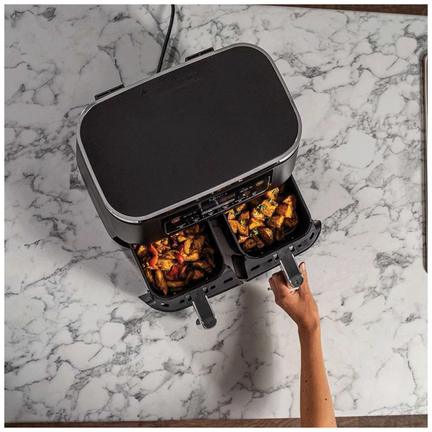 Koristite funkciju SYNC za pripremu dva različita obroka s različitim programima, različitim vremenima kuhanja i različitim temperaturama u odvojenim odjeljcima za prženje, tako da sve bude spremno za posluživanje u isto vrijeme!