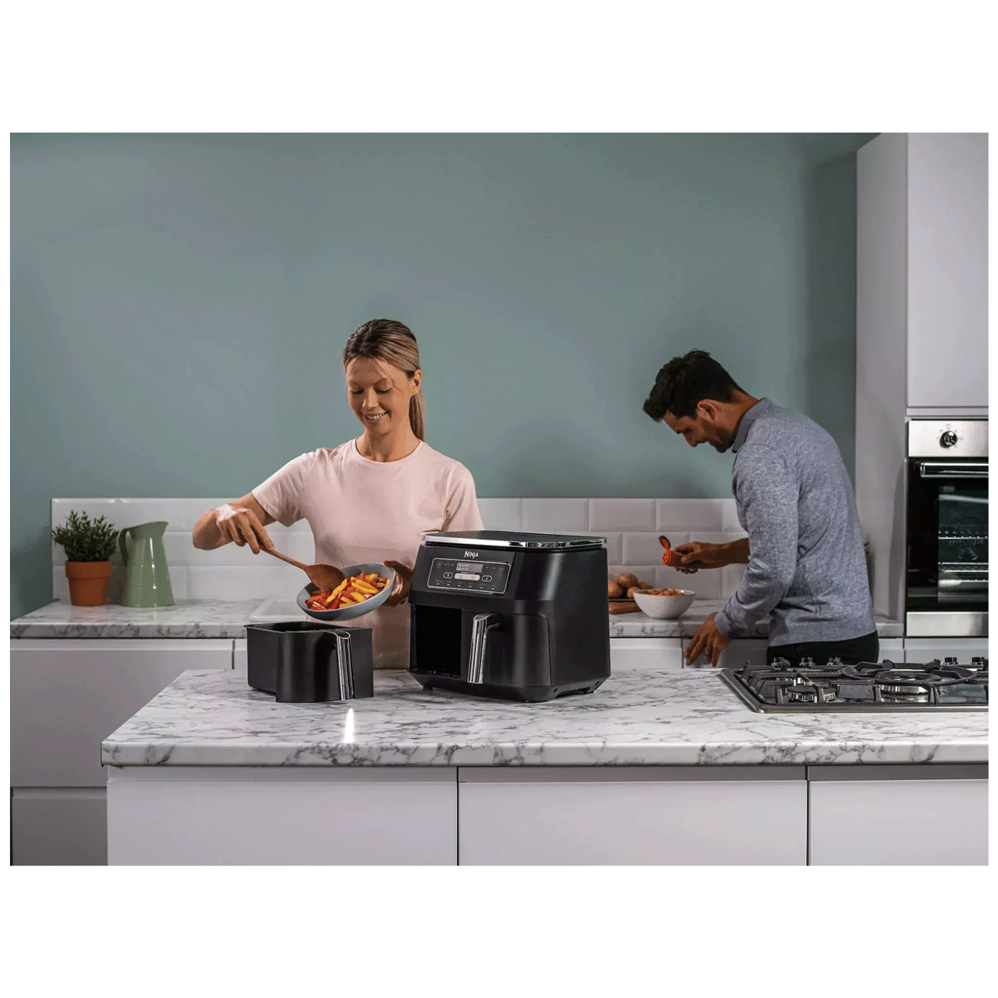 Kad kuhate, vrijeme je sve. Ninja Foodi Dual Zone Air Fryer kapaciteta 7,6 l pomaže vam pripremiti svoj obrok do savršenstva i poslužiti ga u isto vrijeme.