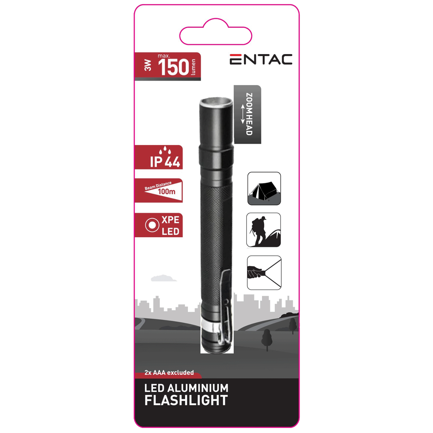 Entac Ručna svjetiljka sa kopčom za remen, 3W, 150 lm, IP44 - EFL-ZOOM-3W-ALU