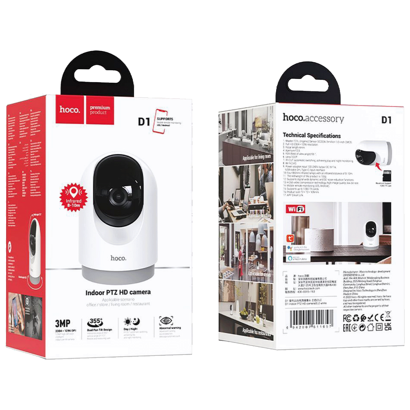 Hoco D1 unutarnja kamera, dizajnirana da osigura sigurnost i mir u domovima, uredima i malim trgovinama. Opremljena naprednom tehnologijom, kamera nudi kristalno jasne slike u Full HD rezoluciji (2304x1296), podršku za dvosmjernu glasovnu komunikaciju, kao i pouzdan noćni vid zahvaljujući infracrvenoj funkciji. Ovo je inteligentno rješenje za nadzor koje se povezuje na Wi-Fi mrežu, omogućujući korisnicima jednostavan pristup gledanju uživo s bilo kojeg mjesta i uređaja – pametnog telefona ili tableta.
