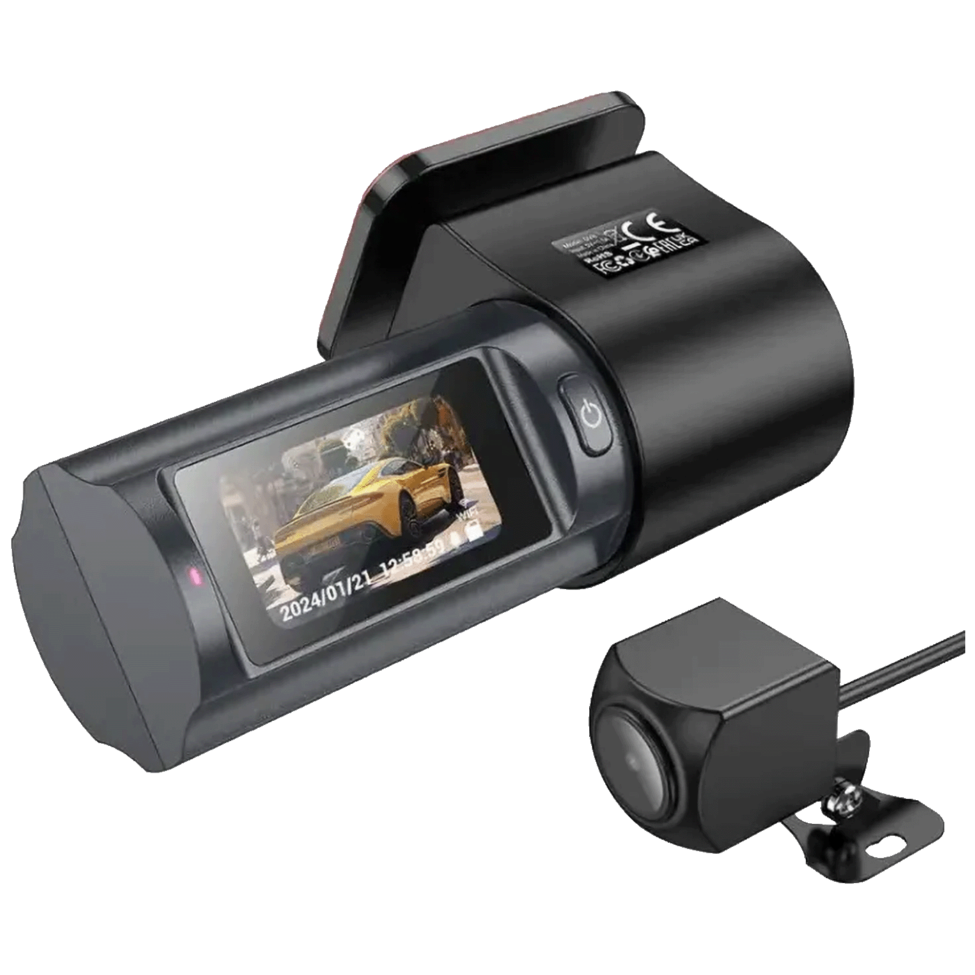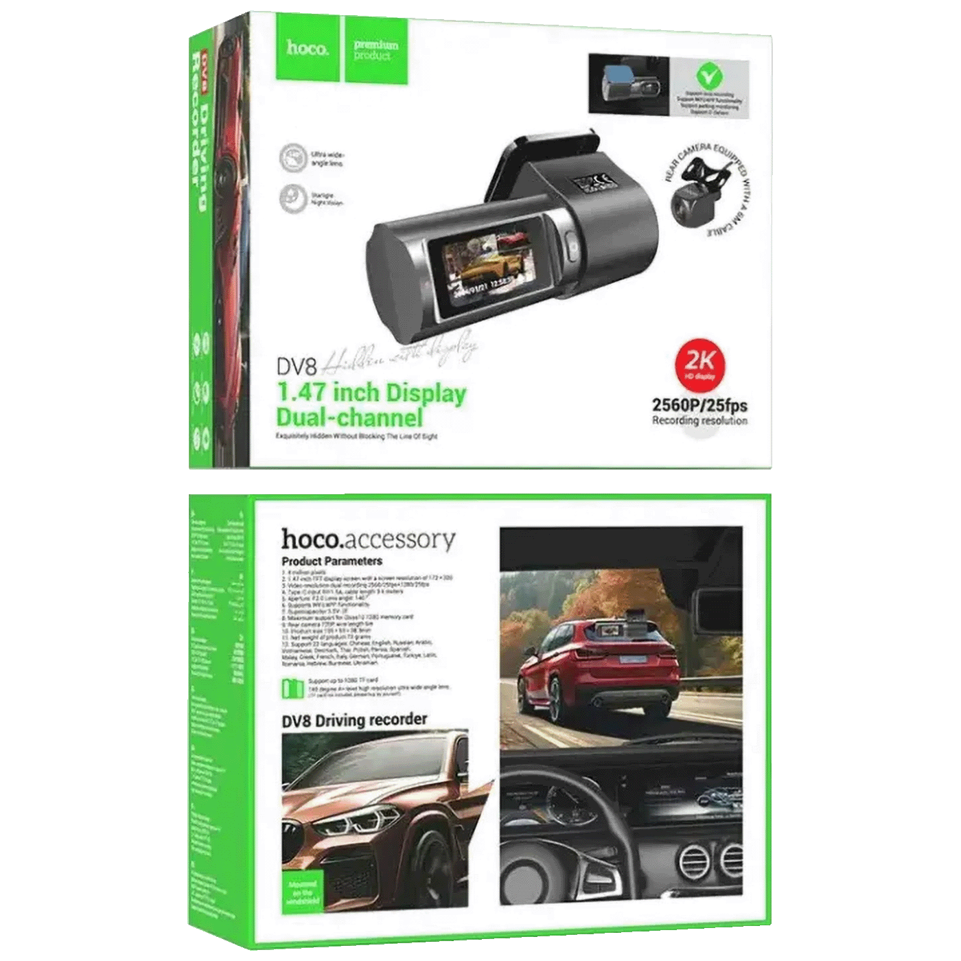 Hoco DV8 prednja + stražnja auto kamera. Glavna kamera sa Lingtong GP2178 + SC4336 senzorom rezolucije 4 milijuna piksela, koja snima video u 2K rezoluciji pri 30 sličica u sekundi, što omogućuje glatke i svijetle snimke, te dodatna stražnja kamera koja snima video u 720P rezoluciji, pružajući jasnu i detaljnu sliku tijekom vožnje i parkiranja. Ugrađeni 1.47" TFT zaslon omogućuje konstantno praćenje situacije oko vozila, a otvor blende F2.0 i široki kut gledanja od 140° omogućit će svijetlo i široko vidno polje.