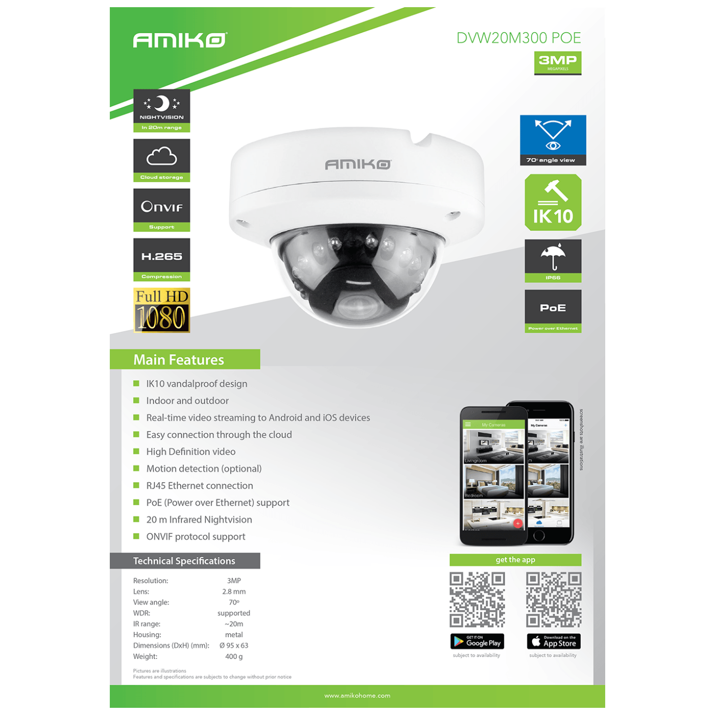 Kamera IP 3 megapiksela, tip kamere Dome, CMOS senzor 1/2.8", Lens 2.8 mm, IR domet 20 metara, fokus fiksni, Infrared LED:14µ x 12, Ethernet 10/100M (RJ45), kut gledanja 65º, H.265 / H.264, aplikacija za smartphone Android / iOS, ONVIF protokol version 2.4, PoE, IK10, IP66 zaštita ( otporna na vodu i prašinu ), metalno kućište, DC 12V / 750mA, radna temperatura -20℃ ~ +60℃, bijela boja