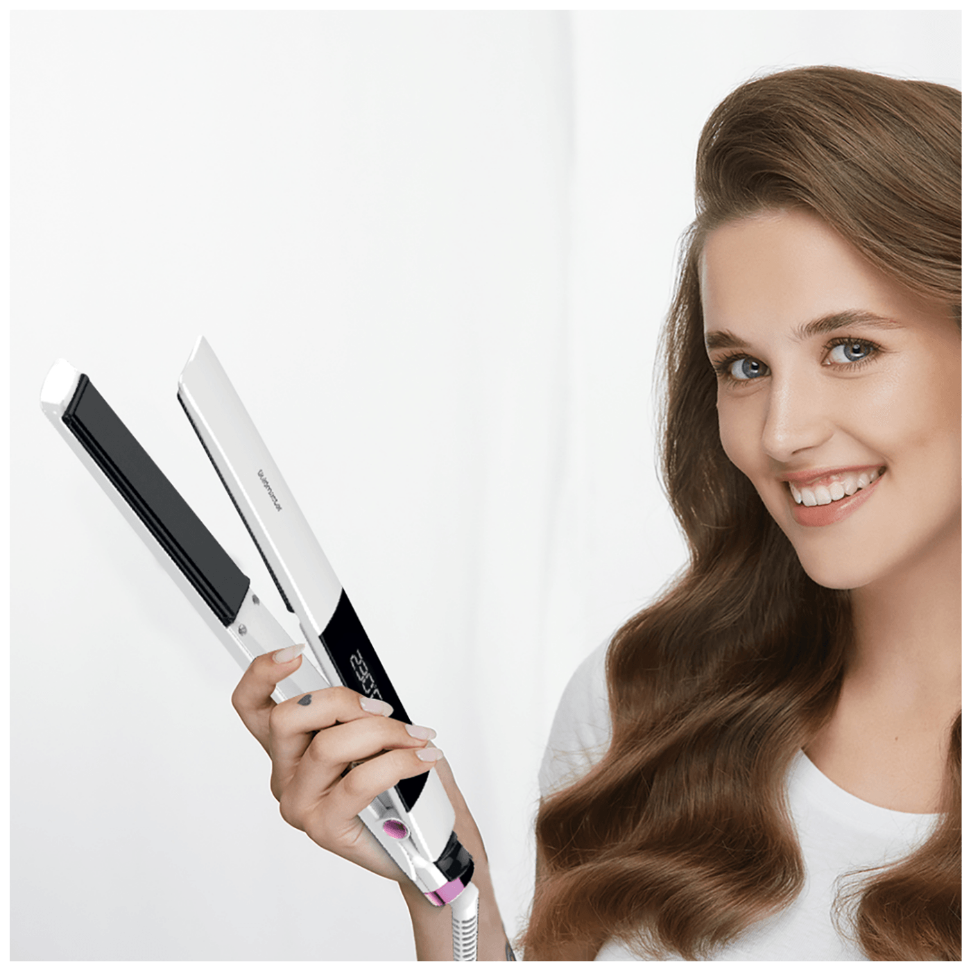 Pegla za kosu, snaga 65W, keramičke ploče obložene keratinom, digitalni zaslon osjetljiv na dodir koji se može zaključati, tipke na dodir za kontrolu temperature i snage, postavke temperature 130-230 °C, dimenzije ploče 110 x 25 mm, automatsko isključivanje nakon 1 sata, putna brava, okretni kabel za 360°, elegantan dizajn, kabel za napajanje 1.8 met.
