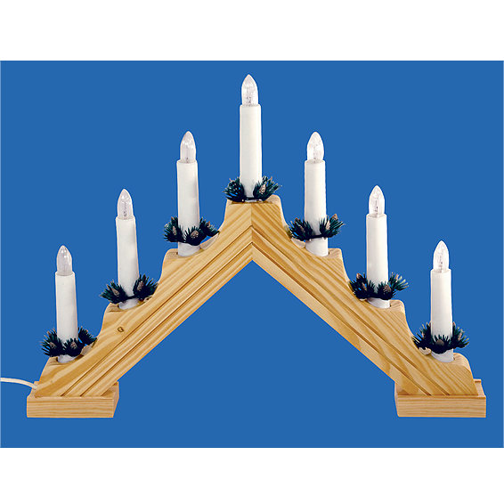 Dekorativna rasvjeta, svijećnjak sa 7 svijeća, boja drveta, 7 bijelih žarulja sa vijkom, postolje lakirano , napajanje 230V, dužina napojnog kabla 1,5 met sa prekidačem