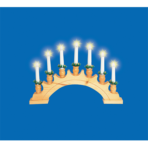 Dekorativna rasvjeta, svijećnjak sa 7 svijeća, boja drveta, 7 bijelih žarulja sa vijkom, postolje lakirano drvo zaobljeno, napajanje 230V, dužina napojnog kabla 1,5 met sa prekidačem