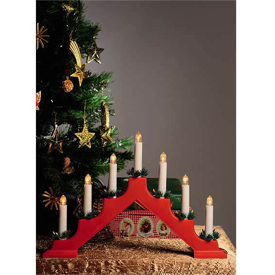 Dekorativna rasvjeta, svijećnjak sa 7 LED svjetala, toplo bijela boja, svijeće visine 10 cm, crveno postolje, plastika, napajanje 2 x 1,5V AA baterije