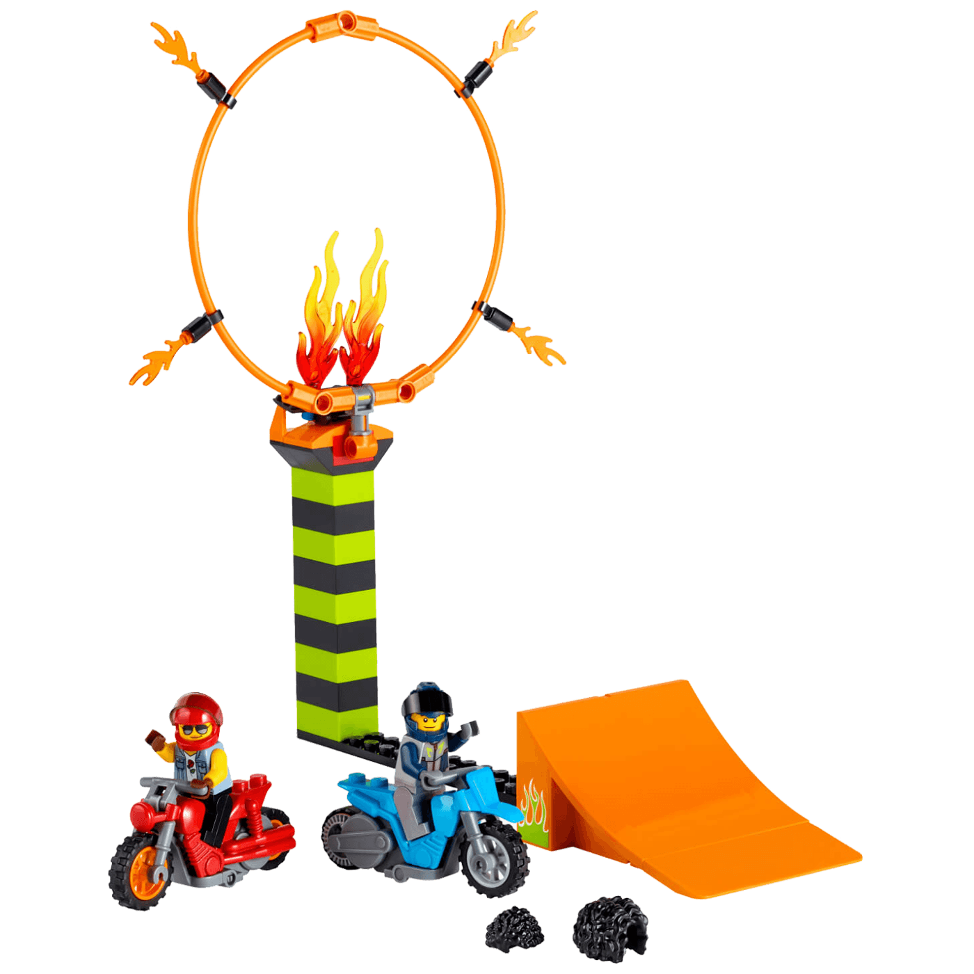 Pokreni akrobatski motocikl sa zamašnjakom i pridruži se junaku televizijske serije LEGO® City Dukeu DeTainu u pravim akcijskim vratolomijama. Skoči s rampe, proleti kroz vatreni obruč i sleti na jedan točak! Zatim pokušaj produžiti skok i podigni vatreni obruč za još veći izazov. Teško će natjecanje postati još teže! Tko će prvi pasti? Saznat ćeš! Uživaj u neprestanoj vratolomnoj akciji u ovom kompletu igračaka.