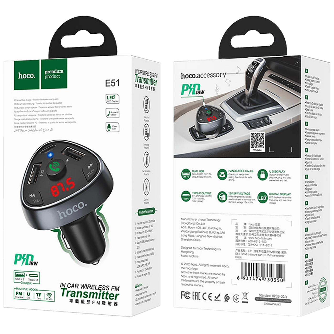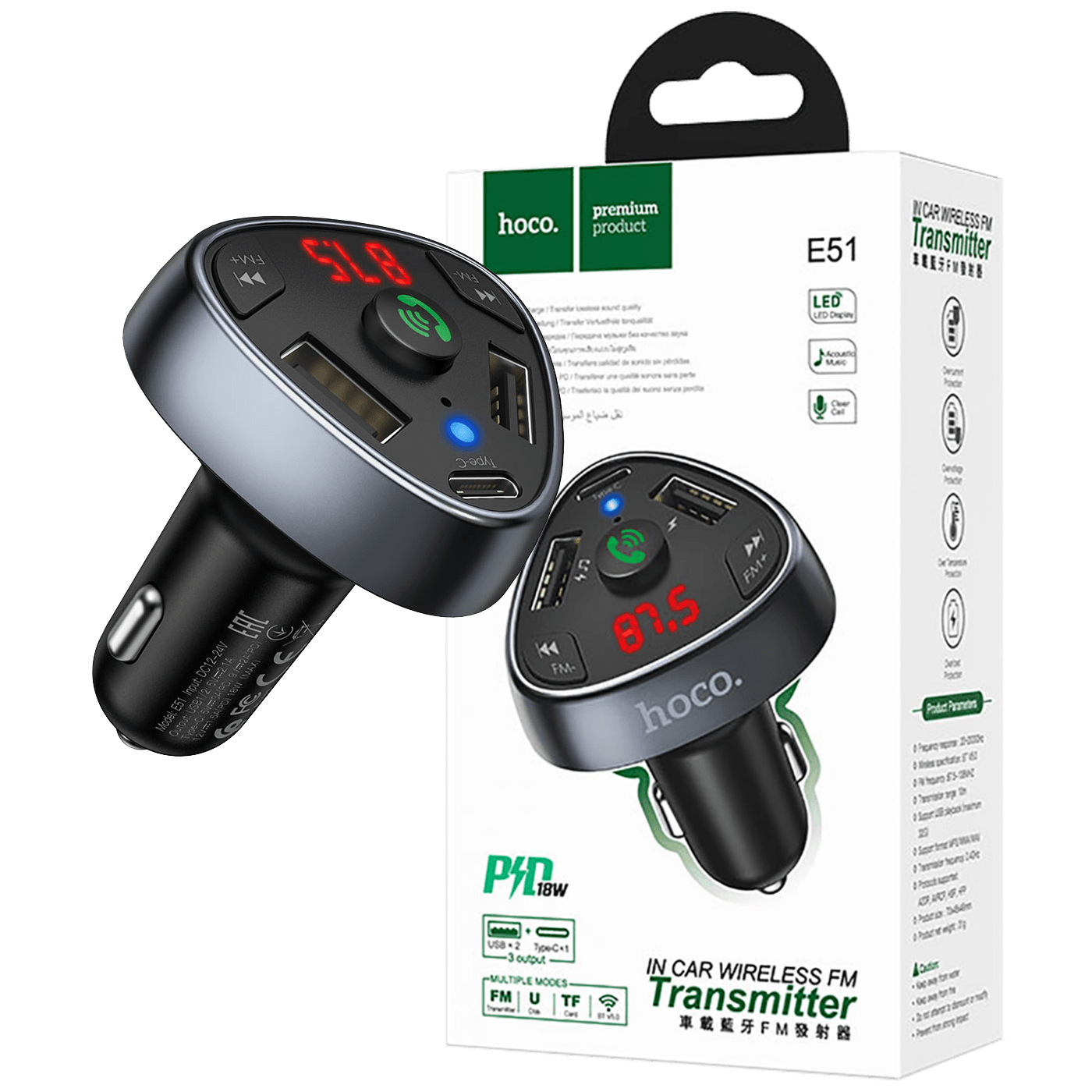 hoco. FM modulator, Bluetooth, 12/24 V, 2xUSB, 1xtype C, PD 18W - E51 Road treasure