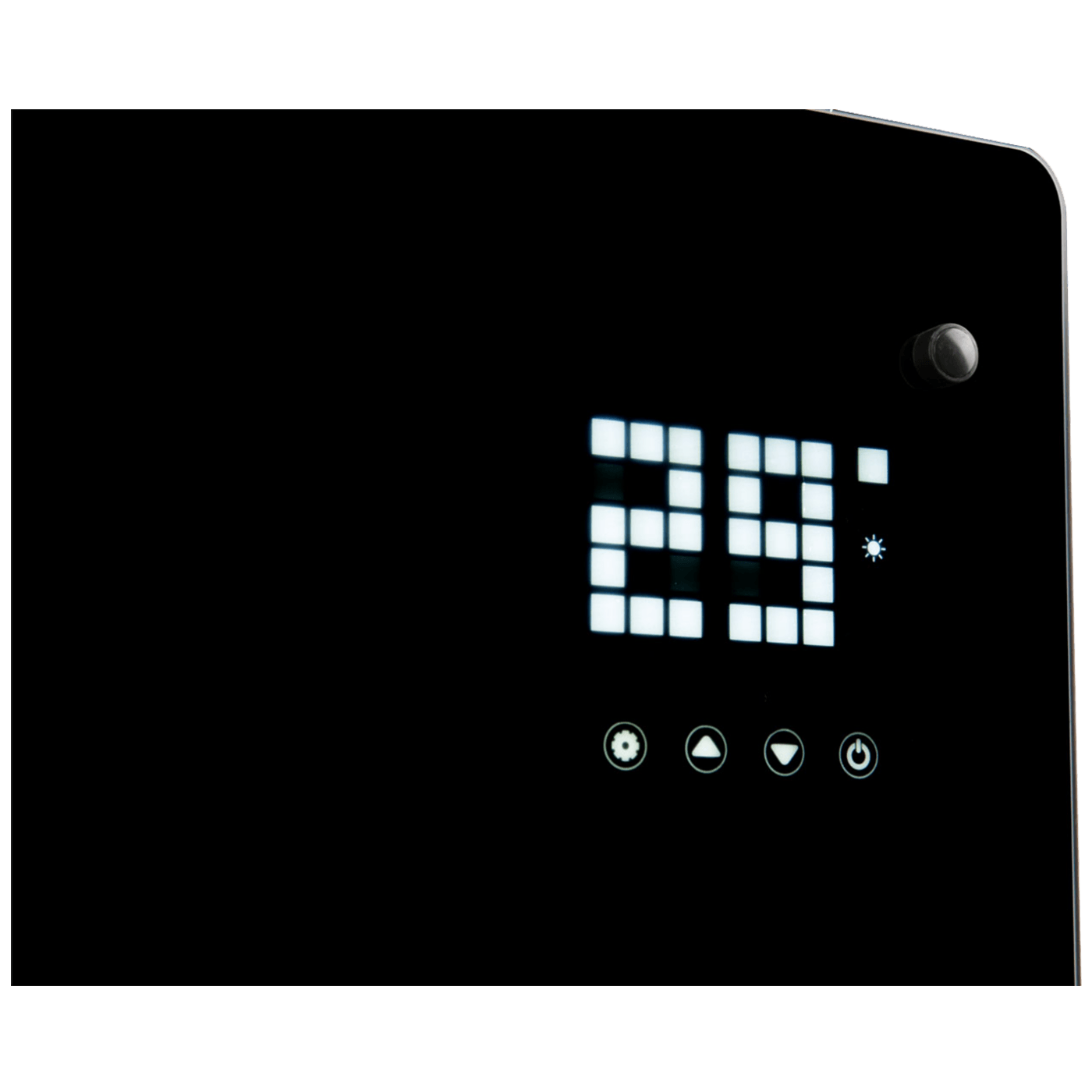 Električna panel / konvektor grijalica sa daljinskim upravljačem, snaga 2000 W, LCD zaslon, upravljačka ploča osjetljiva na dodir, timer do 24 h, senzor sobne temperature, sigurnosni prekidač, zaštita od pregrijavanja, udobna ručka za nošenje, estetska staklena površina, mogućnost ugradnje na zid, IP24, napajanje 220-240V 50/60Hz