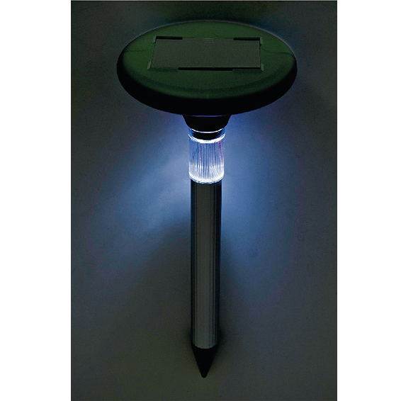 Solarna vrtna LED lampa sa rastjerivačem krtica, solarna ćelija 90 x 60mm, efikasnost do 800m², emisija talasa u intervalima od 50sec, frekvencija 400Hz +/- 100Hz, ugrađena solarna ćelija i punjač za bateriju, zamjenjiva NI-MH baterija 1,2V / 300mAh, izvor svjetlosti LED, materijal izrade plastika / aluminijski stub 250mm