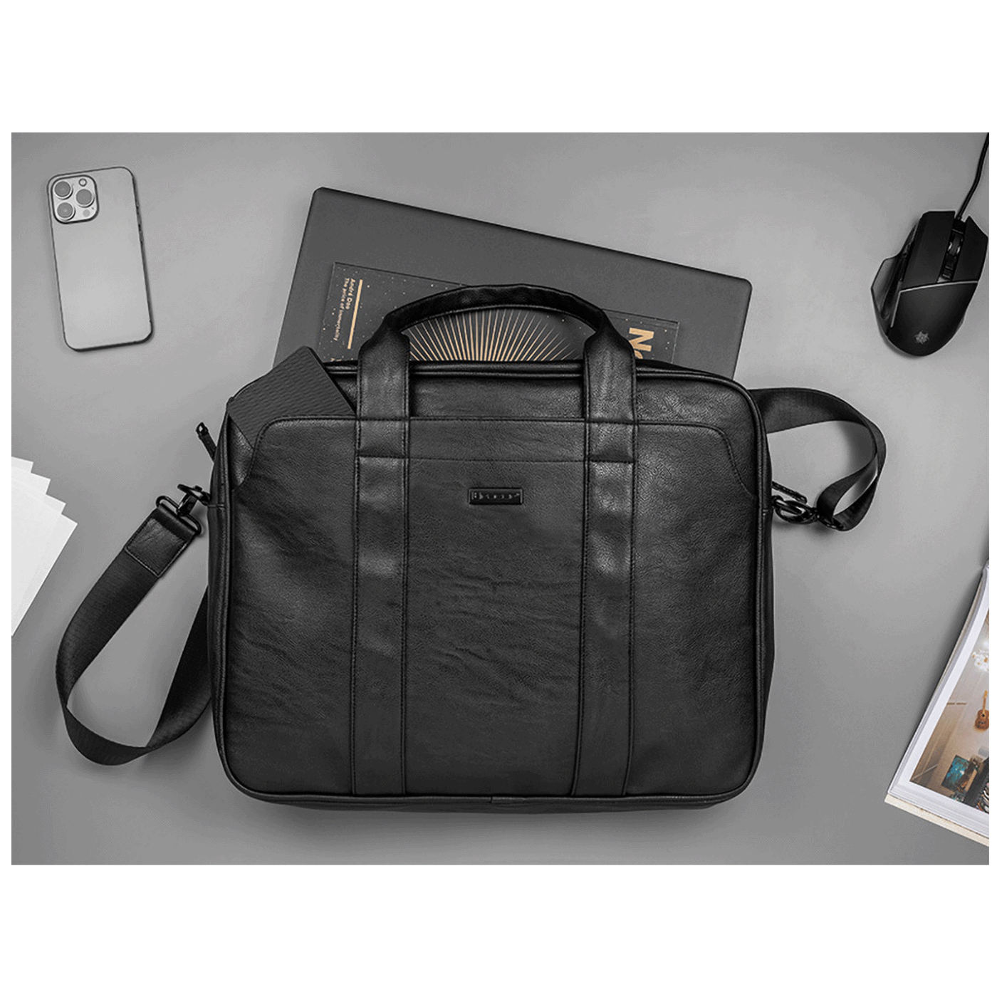 Elementi čvrstog dizajna, kao što su čvrsti materijal, metalni okovi, udobne ručke i podesiva naramenica, jamče udobnost. Unutarnje dimenzije glavnog odjeljka su 39 x 32 x 4 cm, a vanjske dimenzije torbe 44 x 35 x 5 cm. Navlaka za kolica dobro dolazi na putovanjima. Nema potrebe da nosite torbu kada je možete lako pričvrstiti na svoju prtljagu.