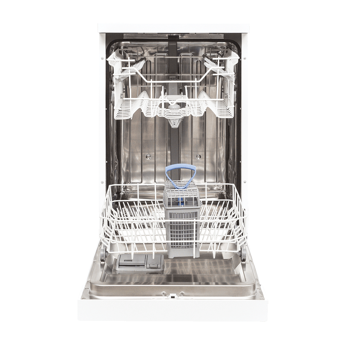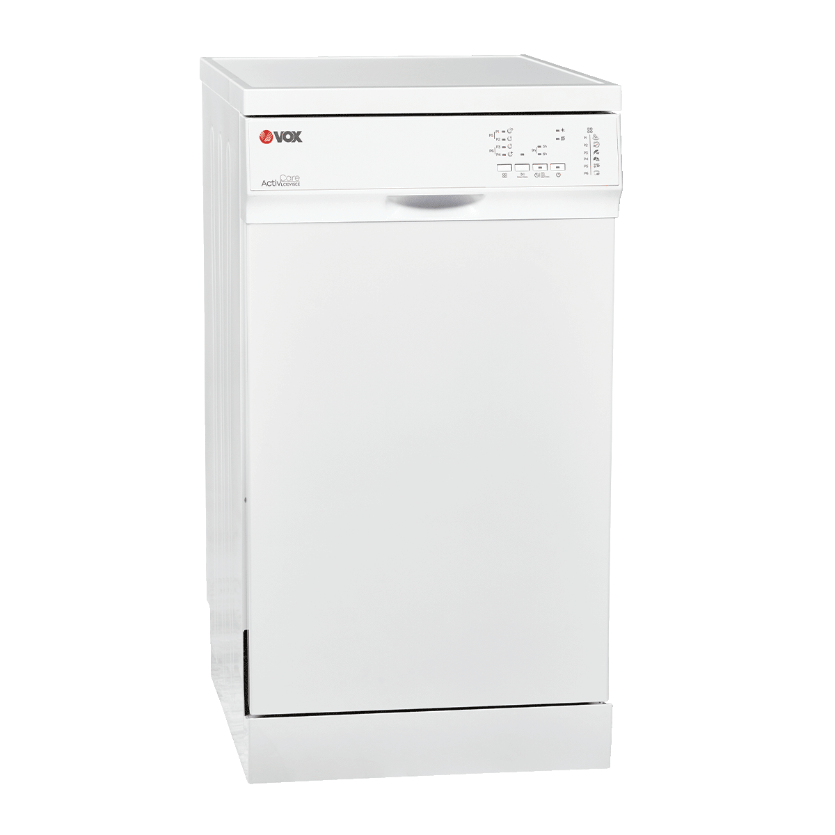 Mašina za pranje suđa, širina 45 cm, mehanička kontrola, 10 kompleta, 6 programa, Prewash, Quick 30min/40°C, Eco, Super 50min/65°C, Delicate 40°C, Intensive 65°C, 3 temperature pranja 40-50-65°C, indikator soli, pokazatelj završetka programa, pokazatelj sredstva za ispiranje, korpa za escajg, podesiva gornja košara, gornja mlaznica, predpranje, odgoda pranja 3/6/9 h, opcija pola pranja, indikator ciklusa pranja, energetski razred E