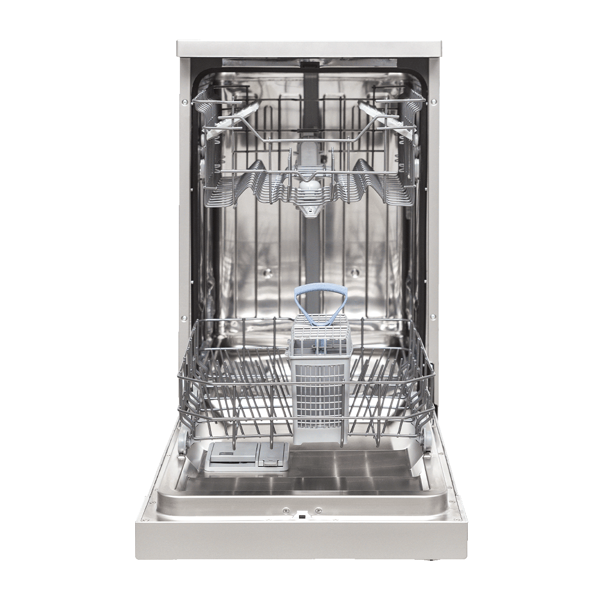 Mašina za pranje suđa, širina 45 cm, mehanička kontrola, 10 kompleta, 6 programa, Prewash, Quick 30min/40°C, Eco, Super 50min/65°C, Delicate 40°C, Intensive 65°C, 3 temperature pranja 40-50-65°C, indikator soli, pokazatelj završetka programa, pokazatelj sredstva za ispiranje, korpa za escajg, podesiva gornja košara, gornja mlaznica, predpranje, odgoda pranja 3/6/9 h, opcija pola pranja, indikator ciklusa pranja, energetski razred E