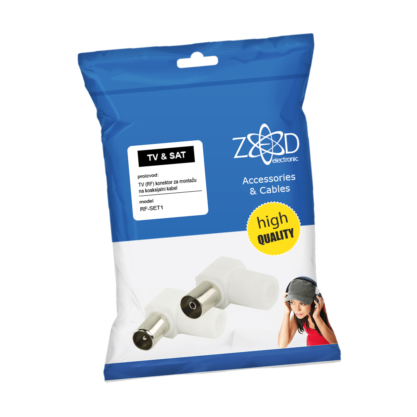TV utikač + TV utičnica, kutni plastični, blister pakiranje sa EAN kodom.